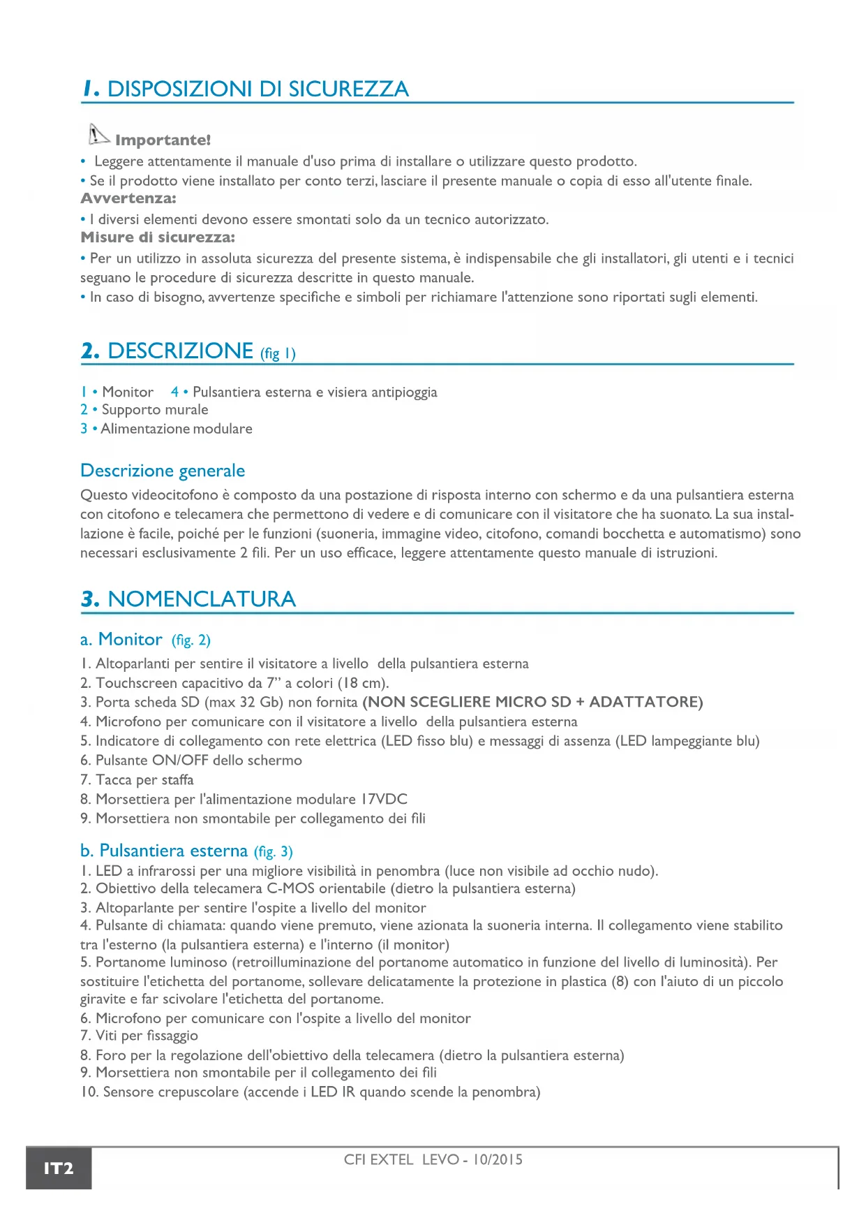 1 • Monitor 4 • Pulsantiera esterna e visiera antipioggia 2 • Supporto murale 3 • Alimentazione modulare Descrizione generale Questo videocitofono è composto da una postazione di risposta interno con schermo e da una pulsantiera esterna con citofono e telecamera che permettono di vedere e di comunicare con il visitatore che ha suonato. La sua instal- lazione è facile, poiché per le funzioni (suoneria, immagine video, citofono, comandi bocchetta e automatismo) sono necessari esclusivamente 2 li. Per un uso efcace, leggere attentamente questo manuale di istruzioni.