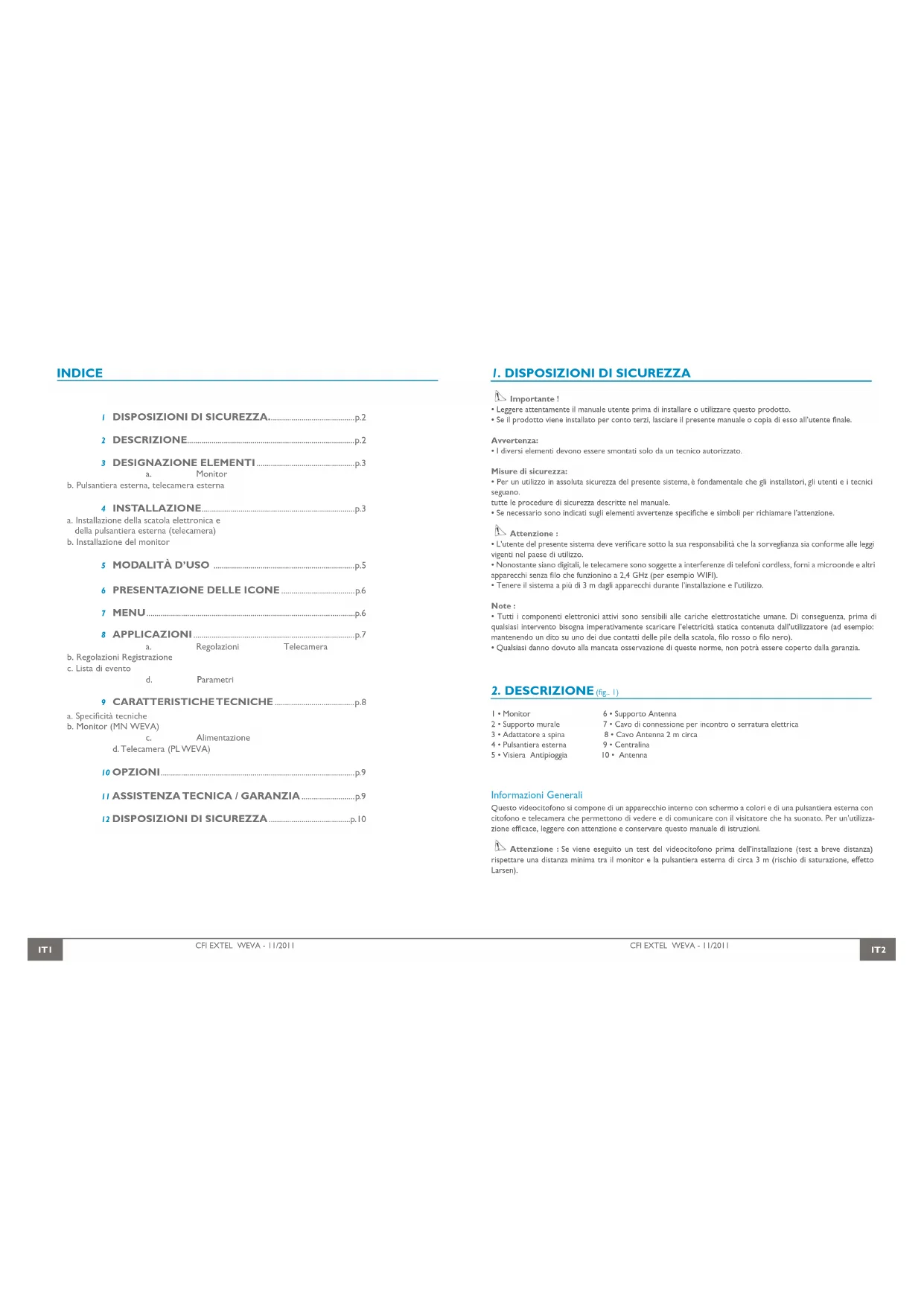 (fig.. 1) 1 • Monitor 6 • Supporto Antenna 2 • Supporto murale 7 • Cavo di connessione per incontro o serratura elettrica 3 • Adattatore a spina 8 • Cavo Antenna 2 m circa 4 • Pulsantiera esterna 9 • Centralina 5 • Visiera Antipioggia 10 • Antenna Informazioni Generali Questo videocitofono si compone di un apparecchio interno con schermo a colori e di una pulsantiera esterna con citofono e telecamera che permettono di vedere e di comunicare con il visitatore che ha suonato. Per un’utilizza- zione efficace, leggere con attenzione e conservare questo manuale di istruzioni. Attenzione : Se viene eseguito un test del videocitofono prima dell’installazione (test a breve distanza) rispettare una distanza minima tra il monitor e la pulsantiera esterna di circa 3 m (rischio di saturazione, effetto Larsen).CFI EXTEL WEVA - 11/2011 IT3
