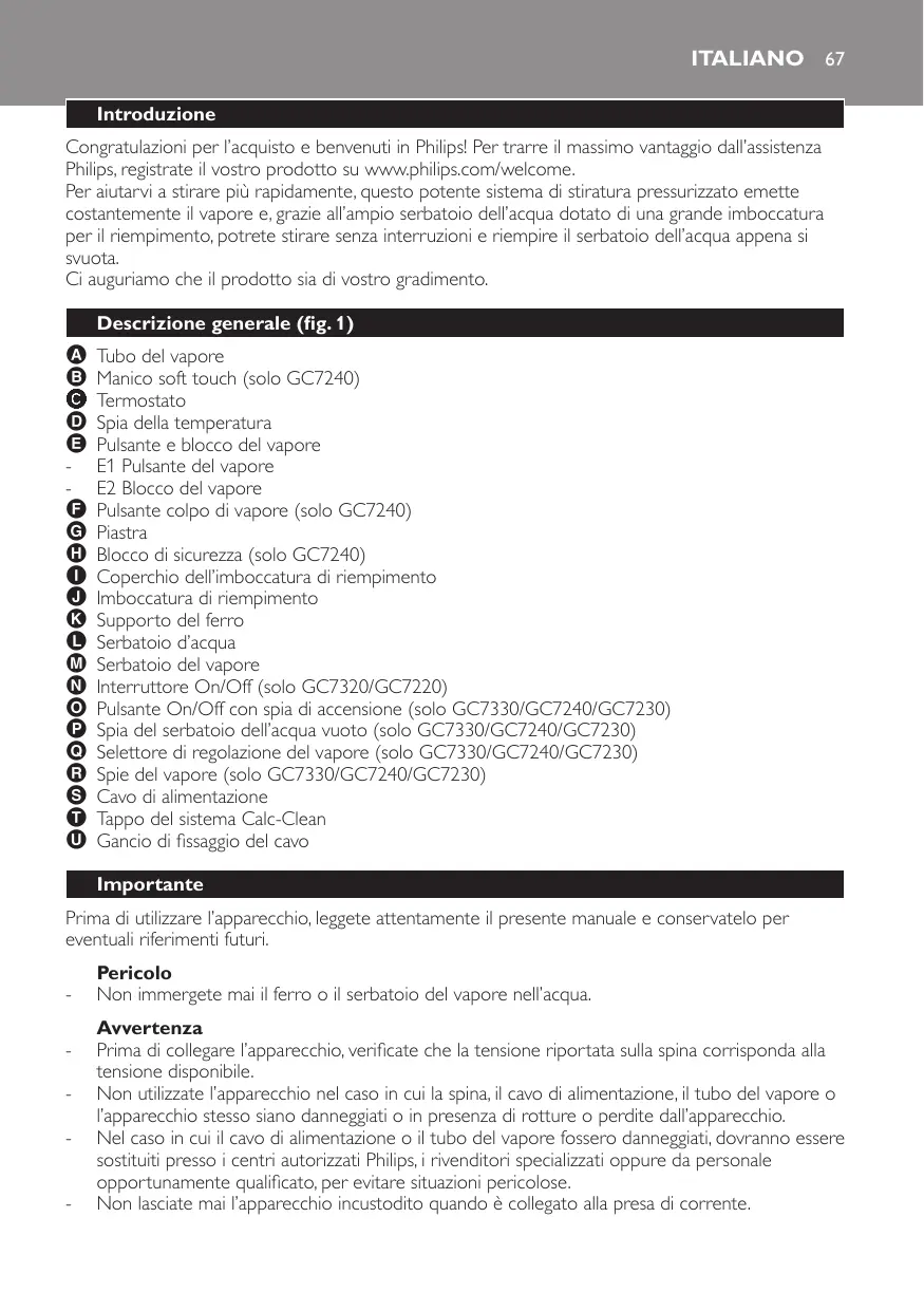 Tubo del vapore Manico soft touch (solo GC7240) Termostato Spia della temperatura Pulsante e blocco del vapore E1 Pulsante del vapore E2 Blocco del vapore Pulsante colpo di vapore (solo GC7240) Piastra Blocco di sicurezza (solo GC7240) Coperchio dell’imboccatura di riempimento Imboccatura di riempimento Supporto del ferro Serbatoio d’acqua Serbatoio del vapore Interruttore On/Off (solo GC7320/GC7220) Pulsante On/Off con spia di accensione (solo GC7330/GC7240/GC7230) Spia del serbatoio dell’acqua vuoto (solo GC7330/GC7240/GC7230) Selettore di regolazione del vapore (solo GC7330/GC7240/GC7230) Spie del vapore (solo GC7330/GC7240/GC7230) Cavo di alimentazione Tappo del sistema Calc-Clean Gancio di fissaggio del cavo Importante Prima di utilizzare l’apparecchio, leggete attentamente il presente manuale e conservatelo per eventuali riferimenti futuri.