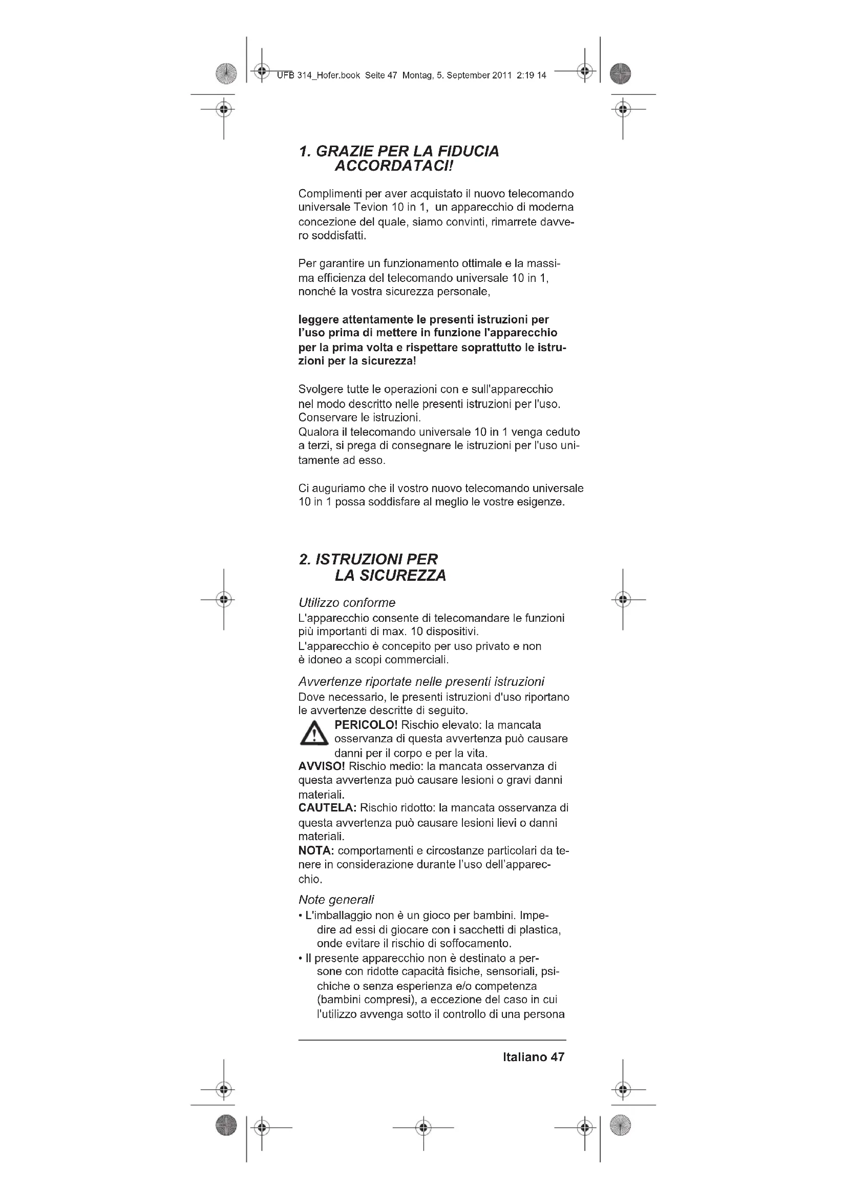 - Il presente apparecchio non è destinato a per- sone con ridotte capacità fisiche, sensoriali, psi- chiche o senza esperienza e/o competenza (bambini compresi), a eccezione del caso in cui l'utilizzo avvenga sotto il controllo di una persona UFB 314_Hofer.book Seite 47 Montag, 5. September 2011 2:19 1448 Italiano responsabile per la sicurezza o nel caso in cui si ricevano indicazioni sull’utilizzo dell’apparecchio.