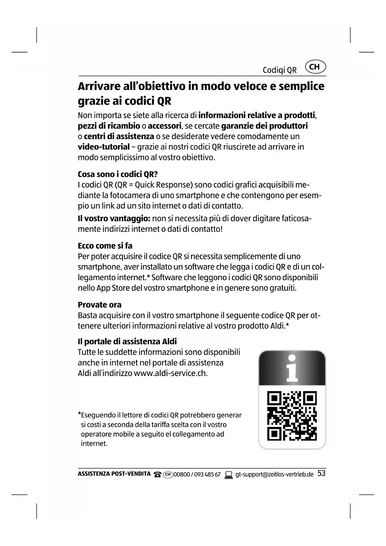 00800 / 093 485 67 Codiqi QR Arrivare all’obiettivo in modo veloce e semplice grazie ai codici QR Non importa se siete alla ricerca di informazioni relative a prodotti, pezzi di ricambio o accessori, se cercate garanzie dei produttori o centri di assistenza o se desiderate vedere comodamente un video-tutorial – grazie ai nostri codici QR riuscirete ad arrivare in modo semplicissimo al vostro obiettivo. Cosa sono i codici QR? I codici QR (QR = Quick Response) sono codici grafici acquisibili me- diante la fotocamera di uno smartphone e che contengono per esem- pio un link ad un sito internet o dati di contatto. Il vostro vantaggio: non si necessita più di dover digitare faticosa- mente indirizzi internet o dati di contatto! Ecco come si fa Per poter acquisire il codice QR si necessita semplicemente di uno smartphone, aver installato un software che legga i codici QR e di un col- legamento internet.* Software che leggono i codici QR sono disponibili nello App Store del vostro smartphone e in genere sono gratuiti. Provate ora Basta acquisire con il vostro smartphone il seguente codice QR per ot- tenere ulteriori informazioni relative al vostro prodotto Aldi.* Il portale di assistenza Aldi Tutte le suddette informazioni sono disponibili anche in internet nel portale di assistenza Aldi all’indirizzo www.aldi-service.ch.