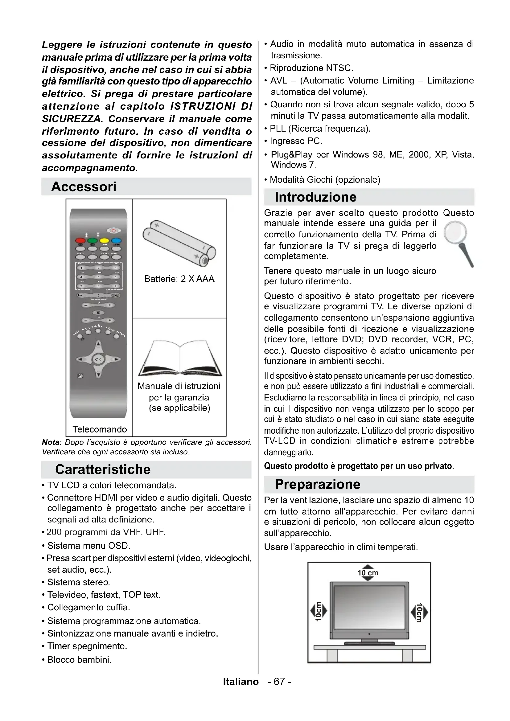 - Modalità Giochi (opzionale) Introduzione Grazie per aver scelto questo prodotto Questo manuale intende essere una guida per il corretto funzionamento della TV. Prima di far funzionare la TV si prega di leggerlo completamente. Tenere questo manuale in un luogo sicuro per futuro riferimento. Questo dispositivo è stato progettato per ricevere e visualizzare programmi TV. Le diverse opzioni di collegamento consentono un’espansione aggiuntiva delle possibile fonti di ricezione e visualizzazione (ricevitore, lettore DVD; DVD recorder, VCR, PC, ecc.). Questo dispositivo è adatto unicamente per funzionare in ambienti secchi. Il dispositivo è stato pensato unicamente per uso domestico, e non può essere utilizzato a fi ni industriali e commerciali. Escludiamo la responsabilità in linea di principio, nel caso in cui il dispositivo non venga utilizzato per lo scopo per cui è stato studiato o nel caso in cui siano state eseguite modifi che non autorizzate. L’utilizzo del proprio dispositivo TV-LCD in condizioni climatiche estreme potrebbe danneggiarlo. Questo prodotto è progettato per un uso privato. Preparazione Per la ventilazione, lasciare uno spazio di almeno 10 cm tutto attorno all’apparecchio. Per evitare danni e situazioni di pericolo, non collocare alcun oggetto sull’apparecchio. Usare l’apparecchio in climi temperati. 10 cm 10 cm 10 cmItaliano - 68 - esposte a calore eccessivo, come luce solare, fuoco o simili. Fulmini In caso di temporali e fulmini o quando si va in vacanza, scollegare il cavo di alimentazione dalla presa di corrente a parete. Pezzi di ricambio Quando sono richiesti dei pezzi di ricambio, assicurarsi che il tecnico del servizio abbia usato i pezzi di ricambio che sono specifi cati dal produttore o abbiano le stesse caratteristiche dell’originale. Le sostituzioni non autorizzate possono causare incendi, scosse elettriche o altri rischi. Assistenza Per l’assistenza, si prega di rivolgersi al personale specializzato. Non togliere da soli il coperchio per evitare di esporsi a scosse elettriche. Smaltimento rifi uti Istruzioni per lo smaltimento dei rifi uti: