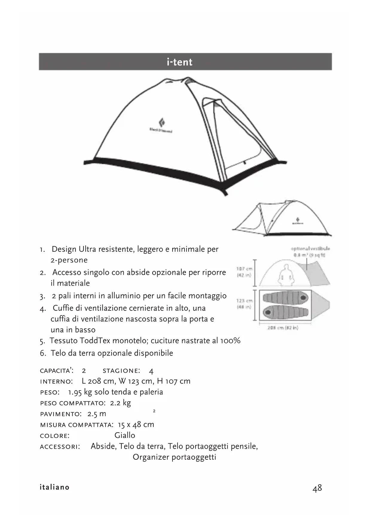 italianooli, grassi, solventi, creme o insetticidi e sarete ricompensati con anni di buon servizio. Affinché il tessuto sia ben protetto rimuovete qualsiasi sporco o umidità dallo stesso prima di riporre la tenda. Lavaggio: se diventasse indispensabile lavare l’intera tenda, non utilizzate acqua calda, candeggina, sapone liquido o detergenti vari. Lavatela a mano in un catino utilizzando acqua fredda con MiraZyme, della McNett™ Corporation. Questo prodotto per la pulizia, elimina gli odori, ed aiuta a rimuovere le tracce di muffa. È ordinabile anche tramite il servizio Black Diamond Mail Order. Accertatevi che la tenda sia perfettamente asciutta prima di riporla. Ci vogliono sempre 24 ore o piu’. NON SPRUZZATE IMPERMEABILIZZANTI SPRAY O SIMILARI E NON LAVATELA CON PRODOTTI CHE NON SIANO RACCOMANDATI DALLE BLACK DIAMOND. Utilizzare prodotti non conformi ne farà decadere la garanzia. CERNIERE Le cerniere richiedono manutenzione, specialmente se campeggiate in luoghi sabbiosi o sporchi. La sabbia e lo sporco sono i principali nemici delle cerniere. Pulitele con dei getti d’acqua per farne fuoriuscire lo sporco. Applicate del lubrificante per cerniere quali McNett Zip Care™ che aiuterà a mantenere in funzione la cerniera nel tempo. Inoltre se le cerniere non si chiudono o fanno fatica a scorrere, è importante ripararle correttamente. Spesso è molto semplice ripararle e non è indispensabile sostituirle. Forzarne la chiusura potrebbe danneggiarle in modo irreparabile, causando una maggiore spesa causa la sostituzione completa. PALI Le nostre palerie in alluminio sono incredibilmente resistenti, ma non sono indistruttibili. Se utilizzate correttamente non si romperanno. La finitura anodizzata le protegge contro la corrosione, ma devono comunque essere riposte dopo l’uso, ben asciutte. Quando issate la tenda, è molto importante che i pali si chiudano perfettamente tra loro. Inserti non bloccati possono rompersi facilmente. Il cordino elastico è resistente e tiene ben saldi tra loro i pali. Quando diventa umido o ghiacciato tende a perdere elasticità. I cordini elastici col tempo perdono elasticità e devono essere regolati. Come fare: i cordini sono regolabili—questa è una delle ragioni per cui non mettiamo i terminali sulle palerie. (Per i pali dotati di terminale, utilizzate le pinze per prendere la punta, e fatela uscire dal palo. I terminali sono calettati). Per tirare