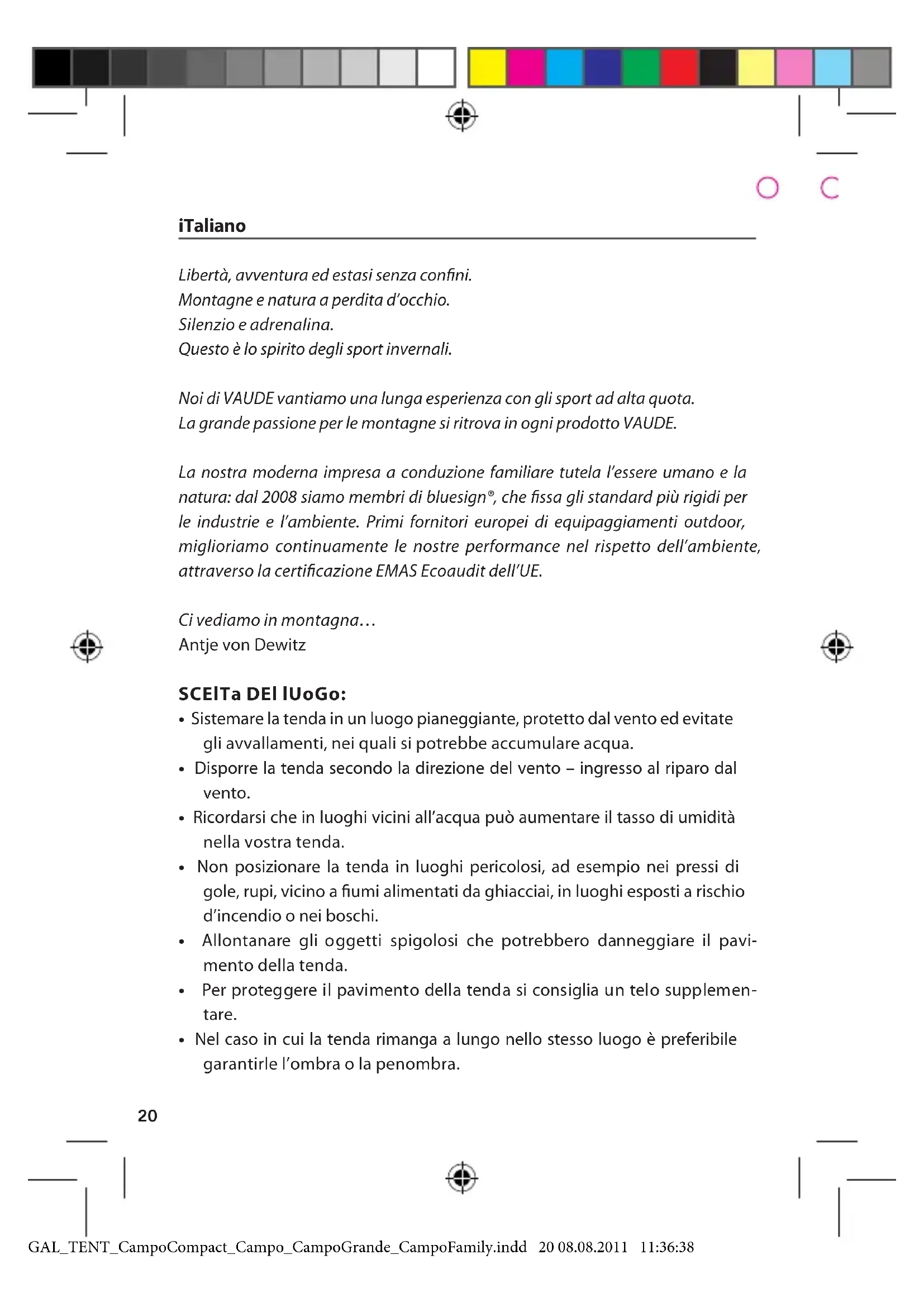 - Ne tendez jamais les cordons et haubans sur des sentiers piétons, dans l’obscurité, cela représente un grand risque de chute. GAL_TENT_CampoCompact_Campo_CampoGrande_CampoFamily.indd 19 08.08.2011 11:36:3720 iTaliano Libertà, avventura ed estasi senza conni. Montagne e natura a perdita d’occhio. Silenzio e adrenalina. Questo è lo spirito degli sport invernali. Noi di VAUDE vantiamo una lunga esperienza con gli sport ad alta quota. La grande passione per le montagne si ritrova in ogni prodotto VAUDE. La nostra moderna impresa a conduzione familiare tutela l’essere umano e la natura: dal 2008 siamo membri di bluesign®, che ssa gli standard più rigidi per le industrie e l’ambiente. Primi fornitori europei di equipaggiamenti outdoor, miglioriamo continuamente le nostre performance nel rispetto dell’ambiente, attraverso la certicazione EMAS Ecoaudit dell’UE. Ci vediamo in montagna… Antje von Dewitz SCElTa DEl lUoGo:
