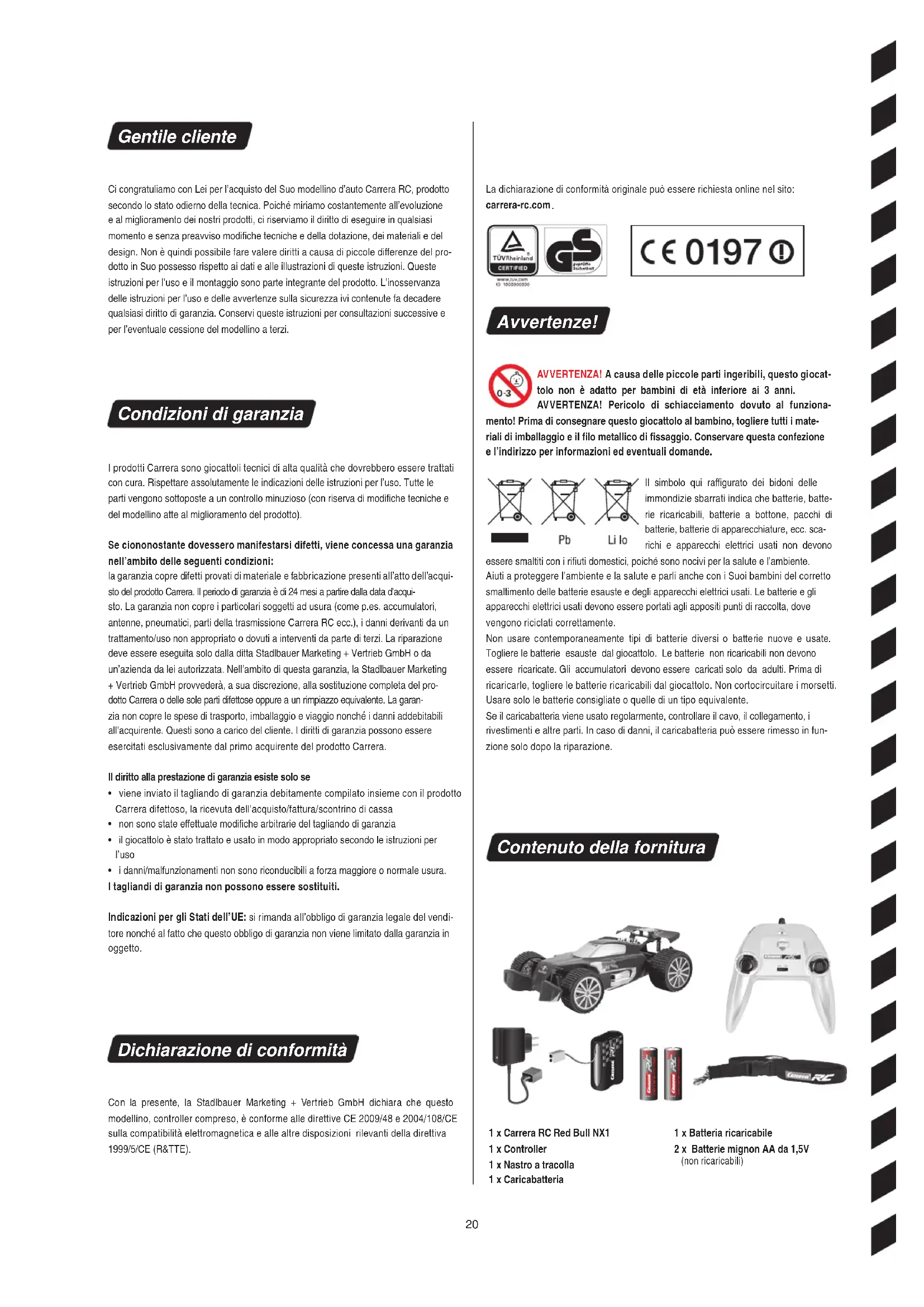 - Tras la carrera, limpiar el vehículo. Realicemos algunas prácticas: Construya un recorrido con límites angulares o con cajas vacías para el vehículo Carrera RC en un lugar amplio y sin obstáculos. Vaya rápido en las rectas y frene en las curvas. Esa es la técnica de control básica para dirigir un vehículo Carrera RC. Los joysticks son extraíbles. El vehículo se puede controlar alternativamente con los balancines de control. Los joysticks se pueden guardar en el compartimento de la parte posterior del controlador, previsto para este fin. Sujete la correa con el gancho mosque- tón por el orificio del controlador, y cuélgueselo del cuello. ¡Advertencias! ¡Peligro de estrangu- lación!20 ALKALINE ALKALINE Gentile cliente Ci congratuliamo con Lei per l’acquisto del Suo modellino d’auto Carrera RC, prodotto secondo lo stato odierno della tecnica. Poiché miriamo costantemente all’evoluzione e al miglioramento dei nostri prodotti, ci riserviamo il diritto di eseguire in qualsiasi momento e senza preavviso modifiche tecniche e della dotazione, dei materiali e del design. Non è quindi possibile fare valere diritti a causa di piccole differenze del pro- dotto in Suo possesso rispetto ai dati e alle illustrazioni di queste istruzioni. Queste istruzioni per l’uso e il montaggio sono parte integrante del prodotto. L’inosservanza delle istruzioni per l’uso e delle avvertenze sulla sicurezza ivi contenute fa decadere qualsiasi diritto di garanzia. Conservi queste istruzioni per consultazioni successive e per l’eventuale cessione del modellino a terzi. Condizioni di garanzia I prodotti Carrera sono giocattoli tecnici di alta qualità che dovrebbero essere trattati con cura. Rispettare assolutamente le indicazioni delle istruzioni per l’uso. Tutte le parti vengono sottoposte a un controllo minuzioso (con riserva di modifiche tecniche e del modellino atte al miglioramento del prodotto). Se ciononostante dovessero manifestarsi difetti, viene concessa una garanzia nell’ambito delle seguenti condizioni: la garanzia copre difetti provati di materiale e fabbricazione presenti all’atto dell’acqui- sto del prodotto Carrera. Il periodo di garanzia è di 24 mesi a partire dalla data d’acqui- sto. La garanzia non copre i particolari soggetti ad usura (come p.es. accumulatori, antenne, pneumatici, parti della trasmissione Carrera RC ecc.), i danni derivanti da un trattamento/uso non appropriato o dovuti a interventi da parte di terzi. La riparazione deve essere eseguita solo dalla ditta Stadlbauer Marketing + Vertrieb GmbH o da un’azienda da lei autorizzata. Nell’ambito di questa garanzia, la Stadlbauer Marketing + Vertrieb GmbH provvederà, a sua discrezione, alla sostituzione completa del pro- dotto Carrera o delle sole parti difettose oppure a un rimpiazzo equivalente. La garan- zia non copre le spese di trasporto, imballaggio e viaggio nonché i danni addebitabili all’acquirente. Questi sono a carico del cliente. I diritti di garanzia possono essere esercitati esclusivamente dal primo acquirente del prodotto Carrera. Il diritto alla prestazione di garanzia esiste solo se