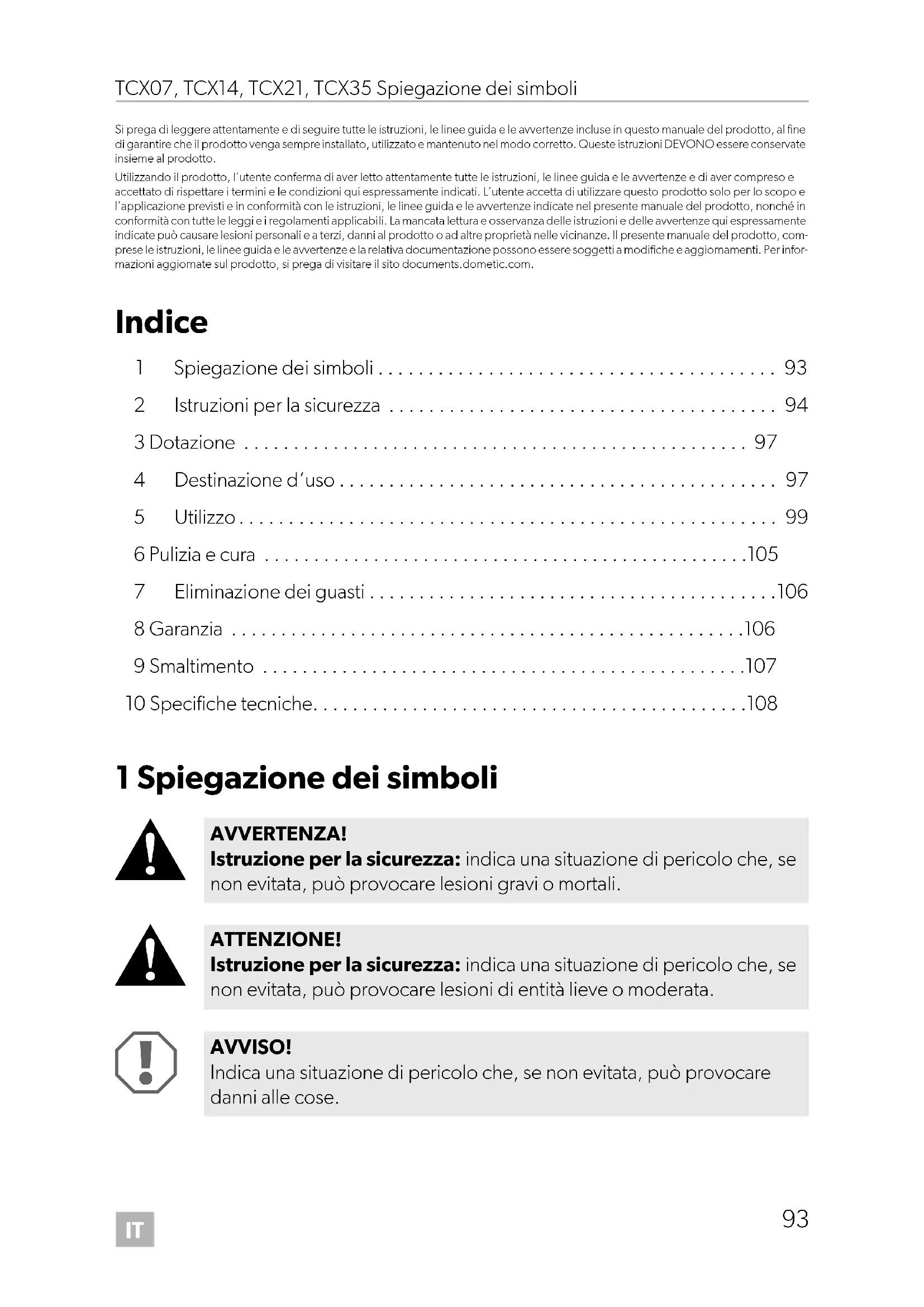 AVVERTENZA! Istruzione per la sicurezza: indica una situazione di pericolo che, se non evitata, può provocare lesioni gravi o mortali. ATTENZIONE! Istruzione per la sicurezza: indica una situazione di pericolo che, se non evitata, può provocare lesioni di entità lieve o moderata. AVVISO! Indica una situazione di pericolo che, se non evitata, può provocare danni alle cose. DometicTCX07-TCX35_OPM_4445103171_EMEA16-ar_202x-xx-xx.book Page 93 Tuesday, November 29, 2022 11:33 AMIT Istruzioni per la sicurezza TCX07, TCX14, TCX21, TCX35