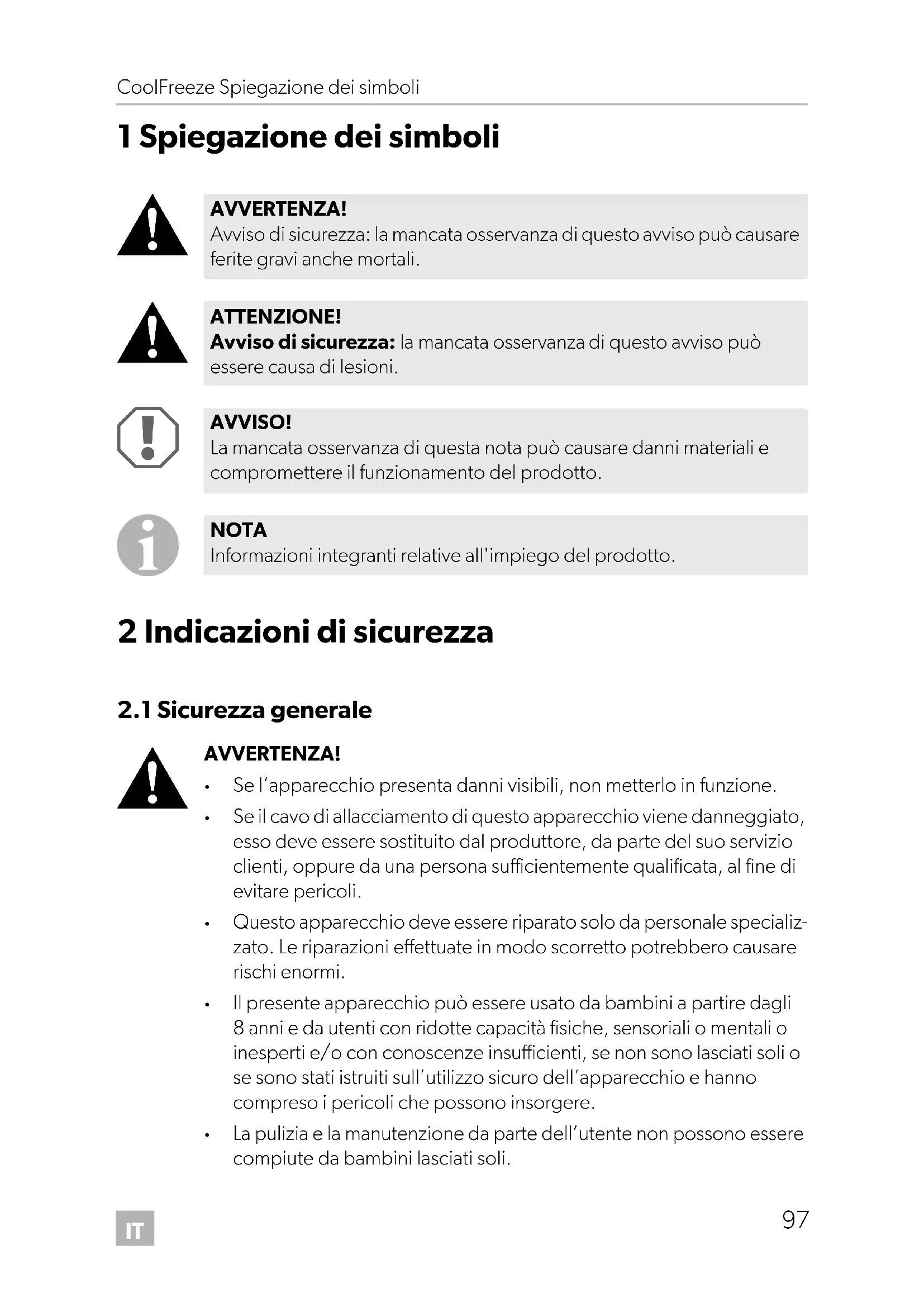 La pulizia e la manutenzione da parte dell’utente non possono essere compiute da bambini lasciati soli. AVVERTENZA! Avviso di sicurezza: la mancata osservanza di questo avviso può causare ferite gravi anche mortali. ATTENZIONE! Avviso di sicurezza: la mancata osservanza di questo avviso può essere causa di lesioni. AVVISO! La mancata osservanza di questa nota può causare danni materiali e compromettere il funzionamento del prodotto. NOTA Informazioni integranti relative all'impiego del prodotto. CDF18-26-36-46--O-16s.book Seite 97 Freitag, 29. Juni 2018 4:25 16IT Indicazioni di sicurezza CoolFreeze