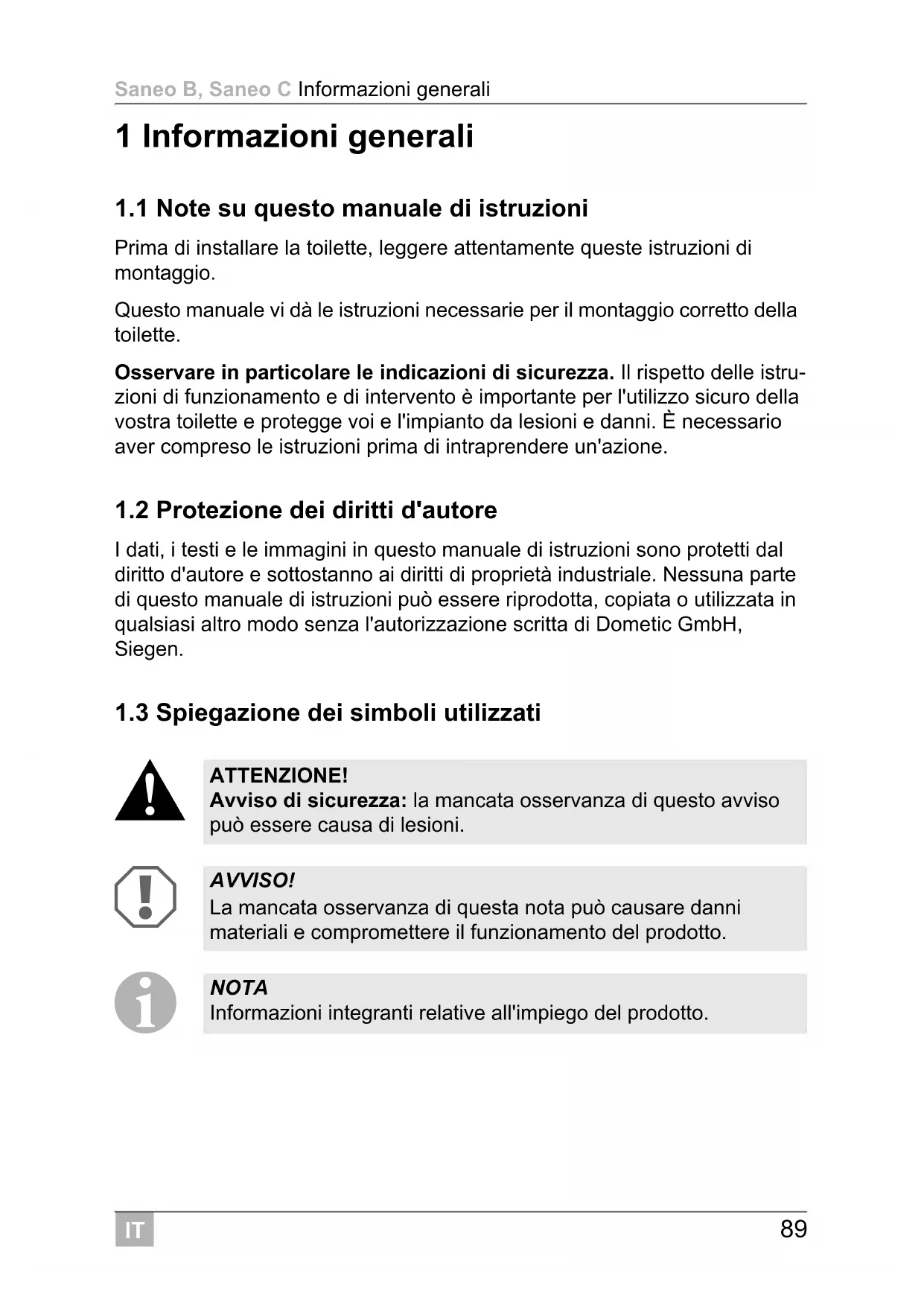 ATTENZIONE! Avviso di sicurezza: la mancata osservanza di questo avviso può essere causa di lesioni. AVVISO! La mancata osservanza di questa nota può causare danni materiali e compromettere il funzionamento del prodotto. NOTA Informazioni integranti relative all'impiego del prodotto.IT Informazioni generali Saneo B, Saneo C