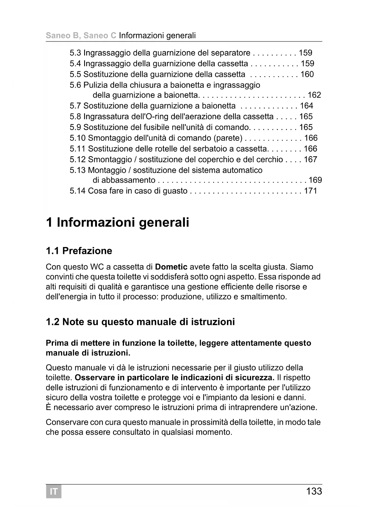 Prima di mettere in funzione la toilette, leggere attentamente questo manuale di istruzioni. Questo manuale vi dà le istruzioni necessarie per il giusto utilizzo della toilette. Osservare in particolare le indicazioni di sicurezza. Il rispetto delle istruzioni di funzionamento e di intervento è importante per l'utilizzo sicuro della vostra toilette e protegge voi e l'impianto da lesioni e danni. È necessario aver compreso le istruzioni prima di intraprendere un'azione. Conservare con cura questo manuale in prossimità della toilette, in modo tale che possa essere consultato in qualsiasi momento.IT Informazioni generali Saneo B, Saneo C