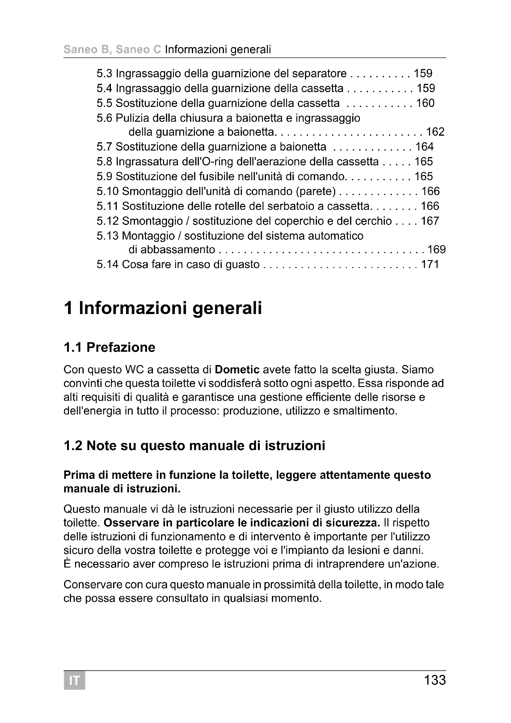 Svuotare completamente il serbatoio di acqua dolce e il sistema di tubi di acqua se non si utilizza la toilette per molto tempo. ➤ Pulire accuratamente la toilette. ➤ Attivare il pulsante di scarico fino a che non si trova più acqua nei tubi. ➤ Interrompere l'alimentazione di acqua verso la toilette. ➤ Svuotare quindi il serbatoio a cassetta e risciacquarlo accuratamente. Pulire la cassetta. Non chiudere il bocchettone di scarico per permettere al serbatoio a cassetta di asciugarsi. ➤ Pulire e ingrassare tutte le guarnizioni e le parti mobili della toilette e del serbatoio a cassetta (capitolo “Manutenzione” a pagina 157) e ripetere quest'operazione prima di rimettere in funzione il WC a cassetta. AVVISO! Non usare antigelo perché potrebbe danneggiare il WC a cassetta.IT Saneo B, Saneo C Manutenzione