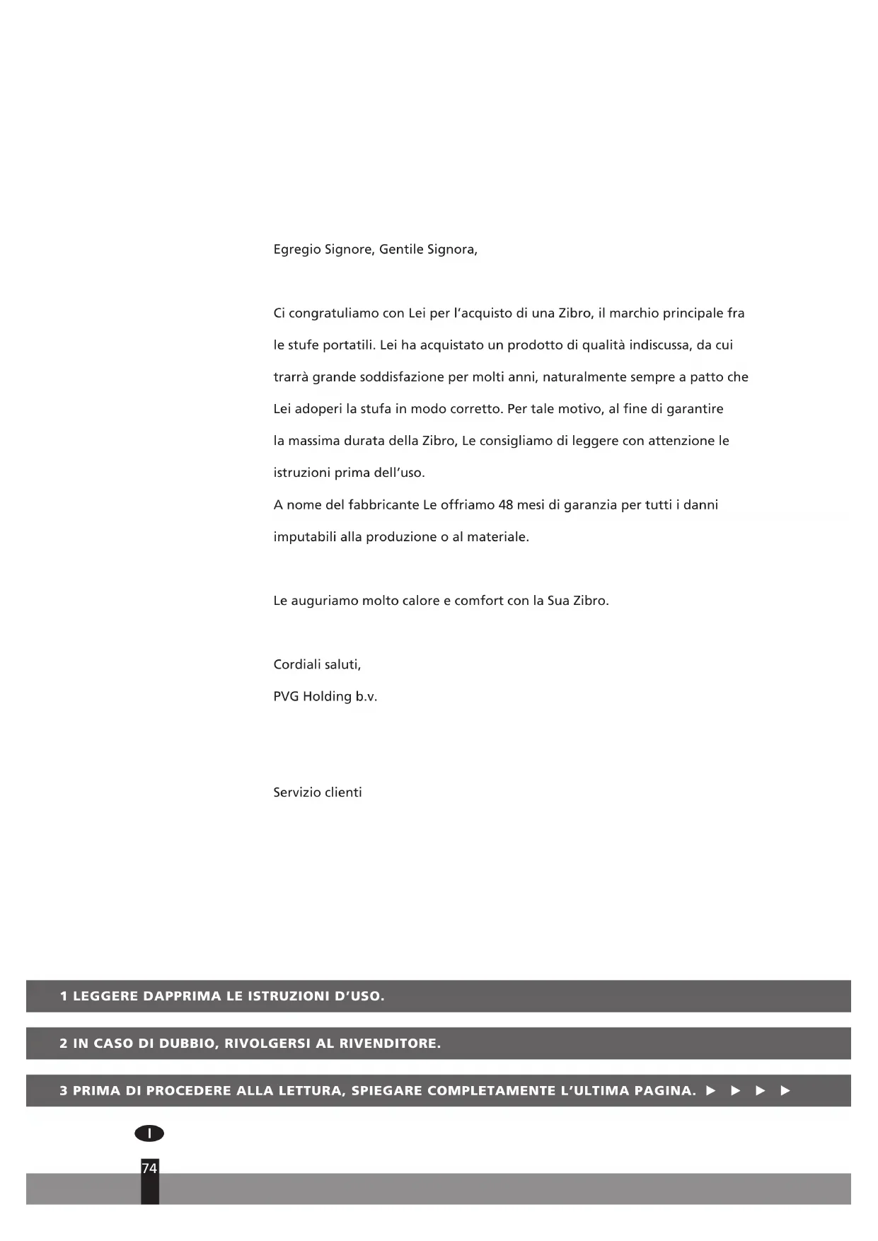 Put the filled removable tank into position. Put the bat- teries into the battery holder (ensure that the positive and negative poles match the + and – marks indicated on the battery housing). Wait 30 minutes after repla- cing the tank and batteries before using the heater. 100 cm 150 cm 50 cm 50 cm 20 cm 50 cm p62_73_uk_R224TC.indd 73 03-06-13 13:41Egregio Signore, Gentile Signora, Ci congratuliamo con Lei per l’acquisto di una Zibro, il marchio principale fra le stufe portatili. Lei ha acquistato un prodotto di qualità indiscussa, da cui trarrà grande soddisfazione per molti anni, naturalmente sempre a patto che Lei adoperi la stufa in modo corretto. Per tale motivo, al fine di garantire la massima durata della Zibro, Le consigliamo di leggere con attenzione le istruzioni prima dell’uso. A nome del fabbricante Le offriamo 48 mesi di garanzia per tutti i danni imputabili alla produzione o al materiale. Le auguriamo molto calore e comfort con la Sua Zibro. Cordiali saluti, PVG Holding b.v. Servizio clienti 1 Leggere dapprima Le istruzioni d’uso. 2 in caso di dubbio, rivoLgersi aL rivenditore. 3 prima di procedere aLLa Lettura, spiegare compLetamente L’uLtima pagina. e e e e