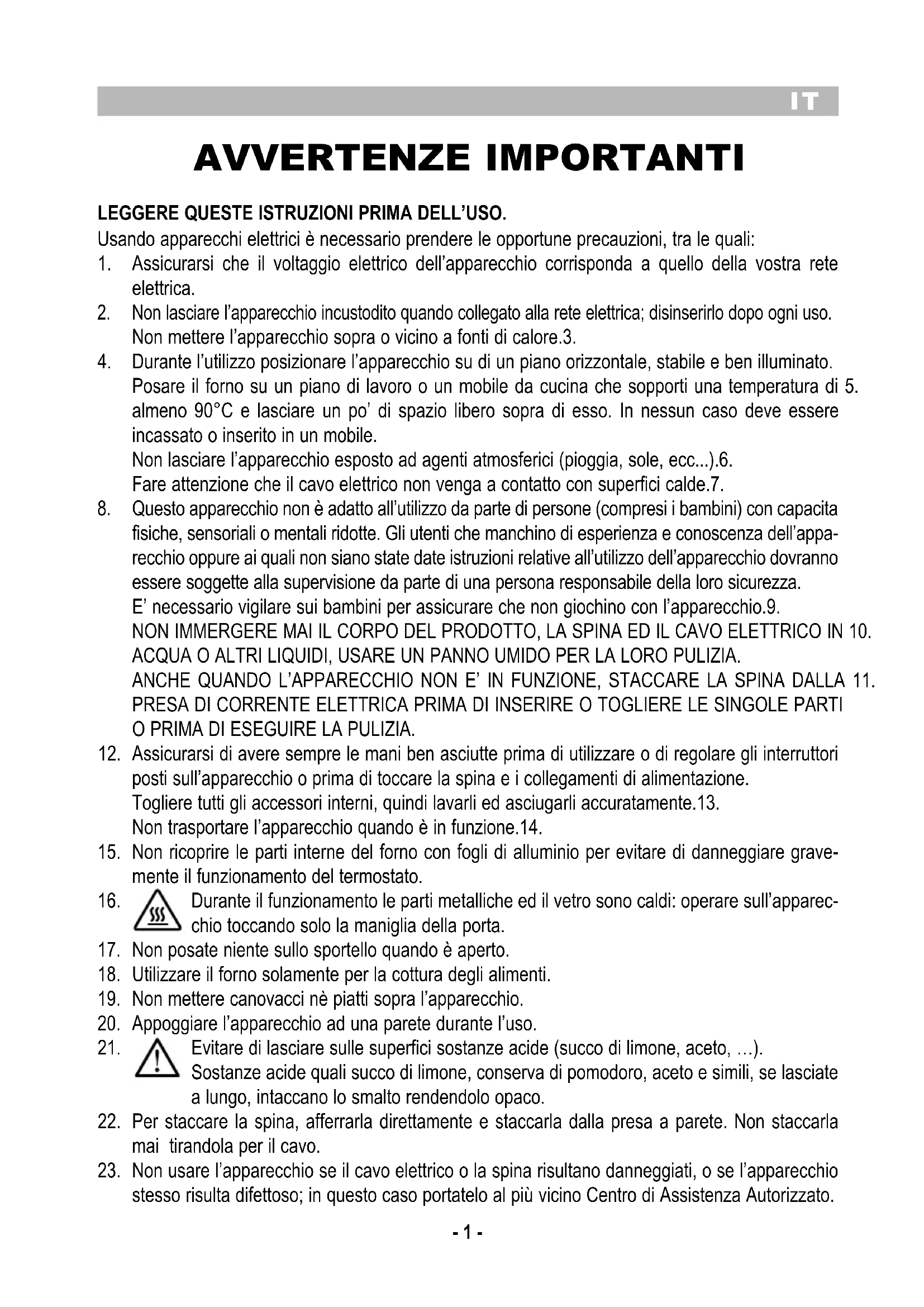 AVVERTENZE IMPORTANTI LEGGERE QUESTE ISTRUZIONI PRIMA DELL’USO. Usando apparecchi elettrici è necessario prendere le opportune precauzioni, tra le quali: Assicurarsi che il voltaggio elettrico dell’apparecchio corrisponda a quello della vostra rete 1. elettrica. Non lasciare l’apparecchio incustodito quando collegato alla rete elettrica; disinserirlo dopo ogni uso.2. Non mettere l’apparecchio sopra o vicino a fonti di calore.3. Durante l’utilizzo posizionare l’apparecchio su di un piano orizzontale, stabile e ben illuminato.4. Posare il forno su un piano di lavoro o un mobile da cucina che sopporti una temperatura di 5. almeno 90°C e lasciare un po’ di spazio libero sopra di esso. In nessun caso deve essere incassato o inserito in un mobile. Non lasciare l’apparecchio esposto ad agenti atmosferici (pioggia, sole, ecc...).6. Fare attenzione che il cavo elettrico non venga a contatto con superfici calde.7. Questo apparecchio non è adatto all’utilizzo da parte di persone (compresi i bambini) con capacita 8. fisiche, sensoriali o mentali ridotte. Gli utenti che manchino di esperienza e conoscenza dell’appa- recchio oppure ai quali non siano state date istruzioni relative all’utilizzo dell’apparecchio dovranno essere soggette alla supervisione da parte di una persona responsabile della loro sicurezza. E’ necessario vigilare sui bambini per assicurare che non giochino con l’apparecchio.9. NON IMMERGERE MAI IL CORPO DEL PRODOTTO, LA SPINA ED IL CAVO ELETTRICO IN 10. ACQUA O ALTRI LIQUIDI, USARE UN PANNO UMIDO PER LA LORO PULIZIA. ANCHE QUANDO L’APPARECCHIO NON E’ IN FUNZIONE, STACCARE LA SPINA DALLA 11. PRESA DI CORRENTE ELETTRICA PRIMA DI INSERIRE O TOGLIERE LE SINGOLE PARTI O PRIMA DI ESEGUIRE LA PULIZIA. Assicurarsi di avere sempre le mani ben asciutte prima di utilizzare o di regolare gli interruttori 12. posti sull’apparecchio o prima di toccare la spina e i collegamenti di alimentazione. Togliere tutti gli accessori interni, quindi lavarli ed asciugarli accuratamente.13. Non trasportare l’apparecchio quando è in funzione.14. Non ricoprire le parti interne del forno con fogli di alluminio per evitare di danneggiare grave-15.