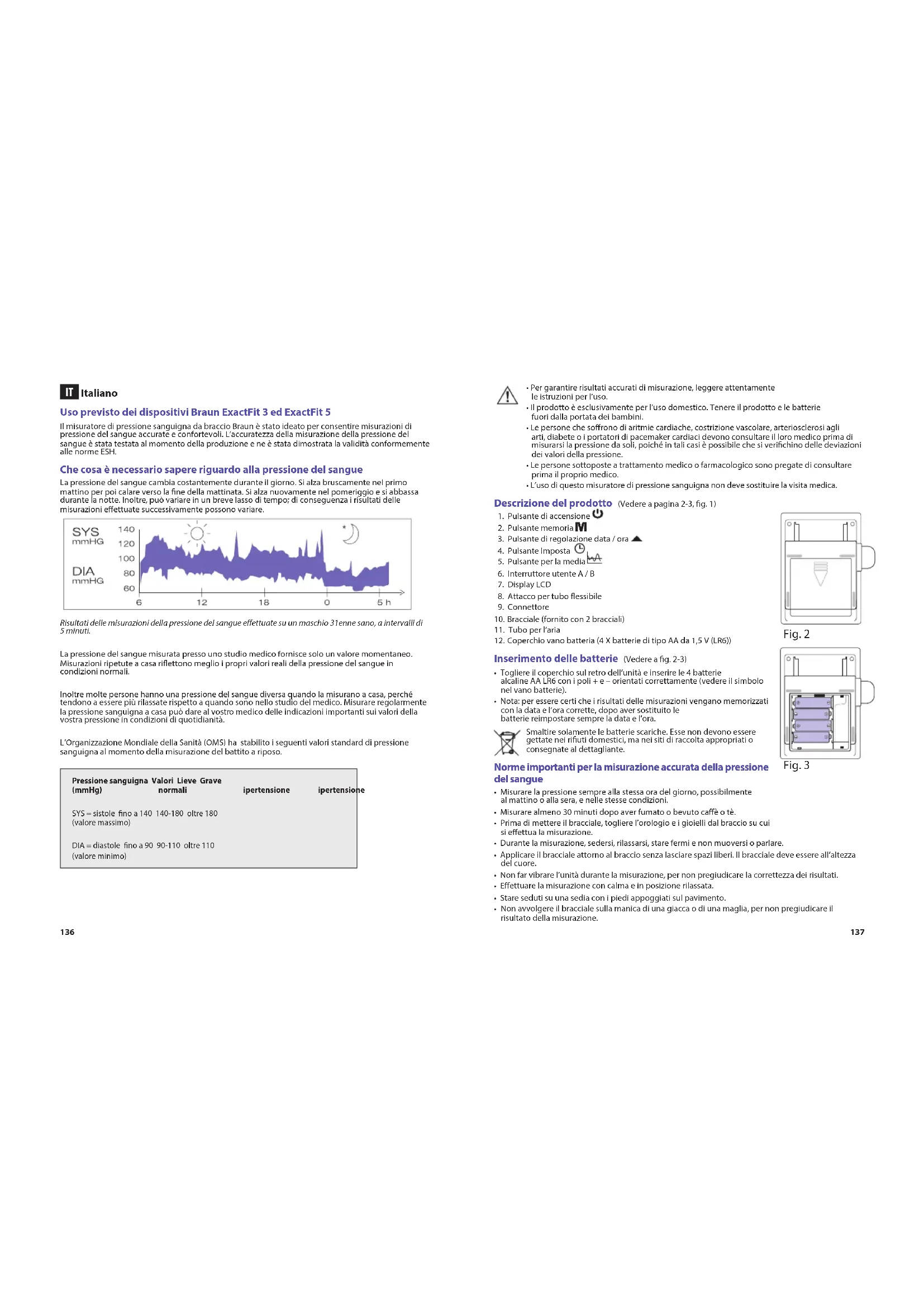 Italiano Uso previsto dei dispositivi Braun ExactFit 3 ed ExactFit 5 Il misuratore di pressione sanguigna da braccio Braun è stato ideato per consentire misurazioni di pressione del sangue accurate e confortevoli. L’accuratezza della misurazione della pressione del sangue è stata testata al momento della produzione e ne è stata dimostrata la validità conformemente alle norme ESH. Che cosa è necessario sapere riguardo alla pressione del sangue La pressione del sangue cambia costantemente durante il giorno. Si alza bruscamente nel primo mattino per poi calare verso la ne della mattinata. Si alza nuovamente nel pomeriggio e si abbassa durante la notte. Inoltre, può variare in un breve lasso di tempo; di conseguenza i risultati delle misurazioni eettuate successivamente possono variare. Risultati delle misurazioni della pressione del sangue eettuate su un maschio 31enne sano, a intervalli di 5 minuti. La pressione del sangue misurata presso uno studio medico fornisce solo un valore momentaneo. Misurazioni ripetute a casa riettono meglio i propri valori reali della pressione del sangue in condizioni normali. Inoltre molte persone hanno una pressione del sangue diversa quando la misurano a casa, perché tendono a essere più rilassate rispetto a quando sono nello studio del medico. Misurare regolarmente la pressione sanguigna a casa può dare al vostro medico delle indicazioni importanti sui valori della vostra pressione in condizioni di quotidianità. L’Organizzazione Mondiale della Sanità (OMS) ha stabilito i seguenti valori standard di pressione sanguigna al momento della misurazione del battito a riposo. Pressione sanguigna Valori Lieve Grave (mmHg) normali ipertensione ipertensione SYS = sistole no a 140 140-180 oltre 180 (valore massimo) DIA = diastole no a 90 90-110 oltre 110 (valore minimo)