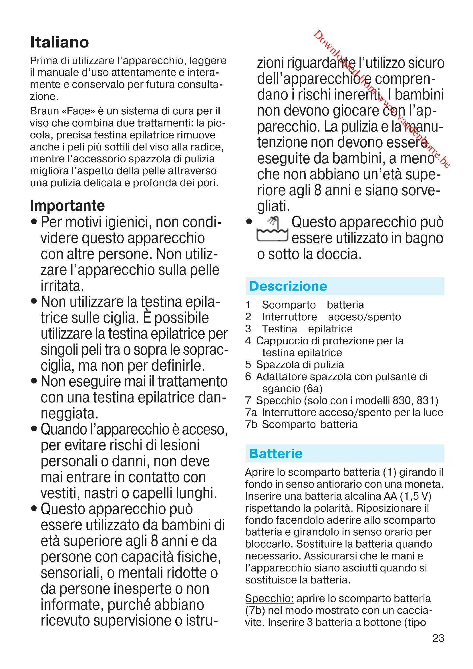 Questo apparecchio può essere utilizzato in bagno o sotto la doccia. Descrizione 1 Scomparto batteria 2 Interruttore acceso/spento 3 Testina epilatrice 4 Cappuccio di protezione per la testina epilatrice 5 Spazzola di pulizia 6 Adattatore spazzola con pulsante di sgancio (6a) 7 Specchio (solo con i modelli 830, 831) 7a Interruttore acceso/spento per la luce 7b Scomparto batteria Batterie Aprire lo scomparto batteria (1) girando il fondo in senso antiorario con una moneta. Inserire una batteria alcalina AA (1,5 V) rispettando la polarità. Riposizionare il fondo facendolo aderire allo scomparto batteria e girandolo in senso orario per bloccarlo. Sostituire la batteria quando necessario. Assicurarsi che le mani e l’apparecchio siano asciutti quando si sostituisce la batteria. Specchio: aprire lo scomparto batteria (7b) nel modo mostrato con un caccia- vite. Inserire 3 batteria a bottone (tipo 96892473_SE810_S4-110.indd 2396892473_SE810_S4-110.indd 23 27.02.14 15:3327.02.14 15:33 CSS APPROVED Effective Date 5Mar2014 GMT - Printed 02Oct2014 Page 23 of 110 Downloaded from www.vandenborre.be24 LR1130) con i poli + verso l’alto. Riposi- zionare il coperchio della batteria. Se scariche o non utilizzate a lungo, le batterie possono perdere. Per proteggere se stessi e l’apparecchio, rimuovere le batterie quando necessario ed evitare il contatto con la pelle in presenza di bat- terie che perdono. Epilazione del viso