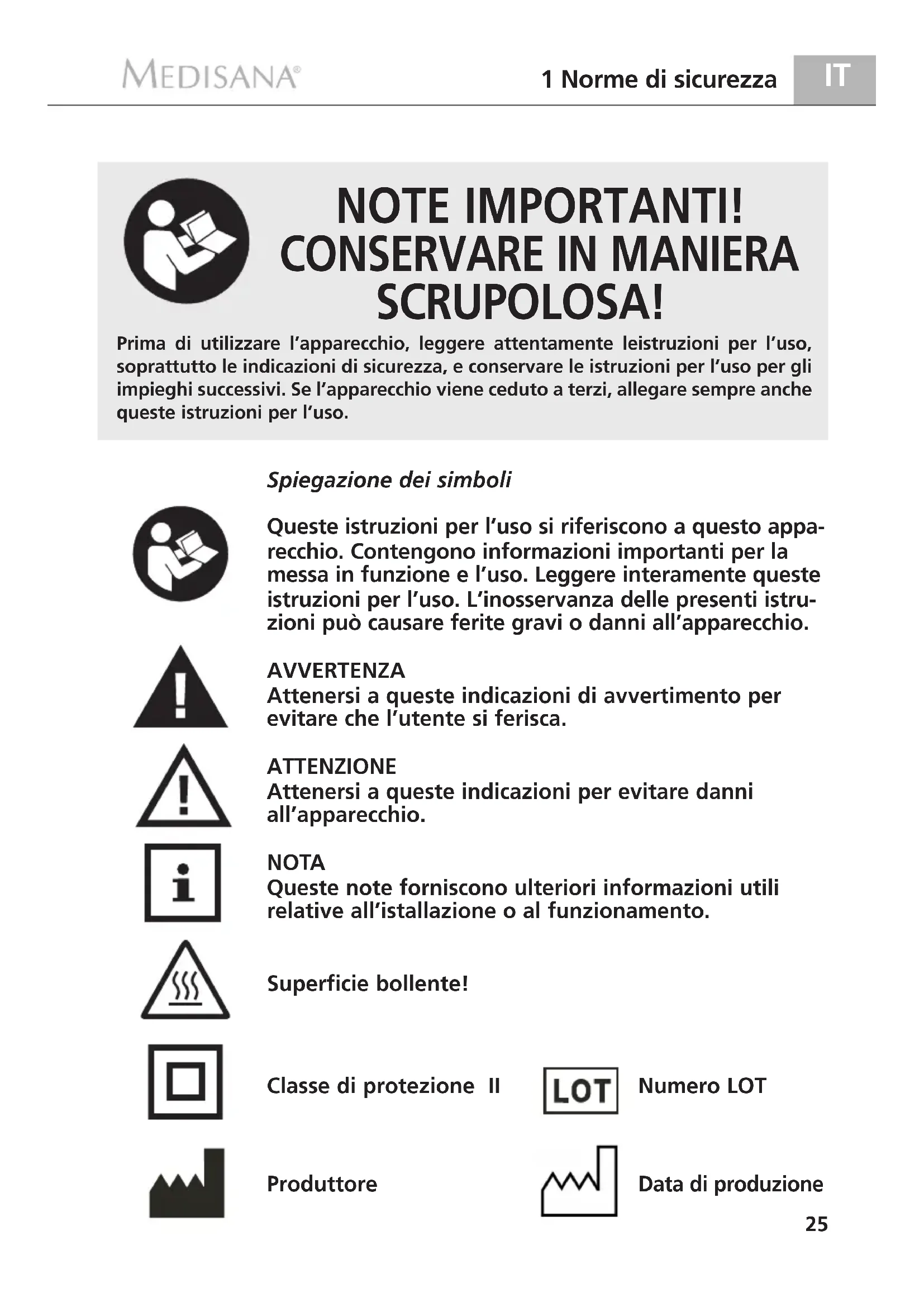 - I prodotti MEDISANA hanno una garanzia di tre anni a partire nella data di vendita. La data di acquisto deve essere comprovata in caso di garanzia alla ricevuta di acquisto o alla fattura.