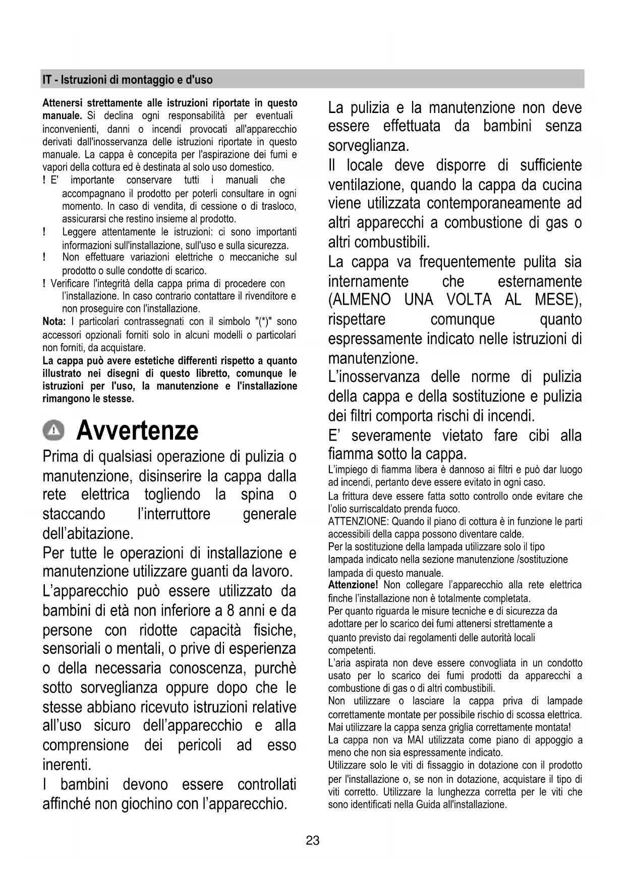 IT - Istruzioni di montaggio e d'uso Attenersi strettamente alle istruzioni riportate in questo manuale. Si declina ogni responsabilità per eventuali inconvenienti, danni o incendi provocati all'apparecchio derivati dall'inosservanza delle istruzioni riportate in questo manuale. La cappa è concepita per l'aspirazione dei fumi e vapori della cottura ed è destinata al solo uso domestico. ! E' importante conservare tutti i manuali che accompagnano il prodotto per poterli consultare in ogni momento. In caso di vendita, di cessione o di trasloco, assicurarsi che restino insieme al prodotto. ! Leggere attentamente le istruzioni: ci sono importanti informazioni sull'installazione, sull'uso e sulla sicurezza. ! Non effettuare variazioni elettriche o meccaniche sul prodotto o sulle condotte di scarico. ! Verificare l'integrità della cappa prima di procedere con l’installazione. In caso contrario contattare il rivenditore e non proseguire con l'installazione. Nota: I particolari contrassegnati con il simbolo "(*)" sono accessori opzionali forniti solo in alcuni modelli o particolari non forniti, da acquistare. La cappa può avere estetiche differenti rispetto a quanto illustrato nei disegni di questo libretto, comunque le istruzioni per l'uso, la manutenzione e l'installazione rimangono le stesse. Avvertenze Prima di qualsiasi operazione di pulizia o manutenzione, disinserire la cappa dalla rete elettrica togliendo la spina o staccando l’interruttore generale dell’abitazione. Per tutte le operazioni di installazione e manutenzione utilizzare guanti da lavoro. L’apparecchio può essere utilizzato da bambini di età non inferiore a 8 anni e da persone con ridotte capacità fisiche, sensoriali o mentali, o prive di esperienza o della necessaria conoscenza, purchè sotto sorveglianza oppure dopo che le stesse abbiano ricevuto istruzioni relative all’uso sicuro dell’apparecchio e alla comprensione dei pericoli ad esso inerenti. I bambini devono essere controllati affinché non giochino con l’apparecchio. La pulizia e la manutenzione non deve essere effettuata da bambini senza sorveglianza. Il locale deve disporre di sufficiente ventilazione, quando la cappa da cucina viene utilizzata contemporaneamente ad altri apparecchi a combustione di gas o altri combustibili. La cappa va frequentemente pulita sia internamente che esternamente (ALMENO UNA VOLTA AL MESE), rispettare comunque quanto espressamente indicato nelle istruzioni di manutenzione. L’inosservanza delle norme di pulizia della cappa e della sostituzione e pulizia dei filtri comporta rischi di incendi. E’ severamente vietato fare cibi alla fiamma sotto la cappa. L’impiego di fiamma libera è dannoso ai filtri e può dar luogo ad incendi, pertanto deve essere evitato in ogni caso. La frittura deve essere fatta sotto controllo onde evitare che l’olio surriscaldato prenda fuoco. ATTENZIONE: Quando il piano di cottura è in funzione le parti accessibili della cappa possono diventare calde. Per la sostituzione della lampada utilizzare solo il tipo lampada indicato nella sezione manutenzione /sostituzione lampada di questo manuale. Attenzione! Non collegare l’apparecchio alla rete elettrica finche l’installazione non è totalmente completata. Per quanto riguarda le misure tecniche e di sicurezza da adottare per lo scarico dei fumi attenersi strettamente a quanto previsto dai regolamenti delle autorità locali competenti. L’aria aspirata non deve essere convogliata in un condotto usato per lo scarico dei fumi prodotti da apparecchi a combustione di gas o di altri combustibili. Non utilizzare o lasciare la cappa priva di lampade correttamente montate per possibile rischio di scossa elettrica. Mai utilizzare la cappa senza griglia correttamente montata! La cappa non va MAI utilizzata come piano di appoggio a meno che non sia espressamente indicato. Utilizzare solo le viti di fissaggio in dotazione con il prodotto per l'installazione o, se non in dotazione, acquistare il tipo di viti corretto. Utilizzare la lunghezza corretta per le viti che sono identificati nella Guida all'installazione.24 In caso di dubbio, consultare il centro di assistenza autorizzato o personale qualificata similare. ATTENZIONE! La mancata installazione di viti e dispositivi di fissaggio in conformità di queste istruzioni può comportare rischi di natura elettrica. Questo apparecchio è contrassegnato in conformità alla Direttiva Europea 2012/19/EC, Waste Electrical and Electronic Equipment (WEEE). Assicurandosi che questo prodotto sia smaltito in modo corretto, l'utente contribuisce a prevenire le potenziali conseguenze negative per l'ambiente e la salute. Il simbolo sul prodotto o sulla documentazione di accompagnamento indica che questo prodotto non deve essere trattato come rifiuto domestico ma deve essere consegnato presso l'idoneo punto di raccolta per il riciclaggio di apparecchiature elettriche ed elettroniche. Disfarsene seguendo le normative locali per lo smaltimento dei rifiuti. Per ulteriori informazioni sul trattamento, recupero e riciclaggio di questo prodotto, contattare l'idoneo ufficio locale, il servizio di raccolta dei rifiuti domestici o il negozio presso il quale il prodotto è stato acquistato. Apparecchiatura progettata, testata e realizzata nel rispetto delle norme sulla: