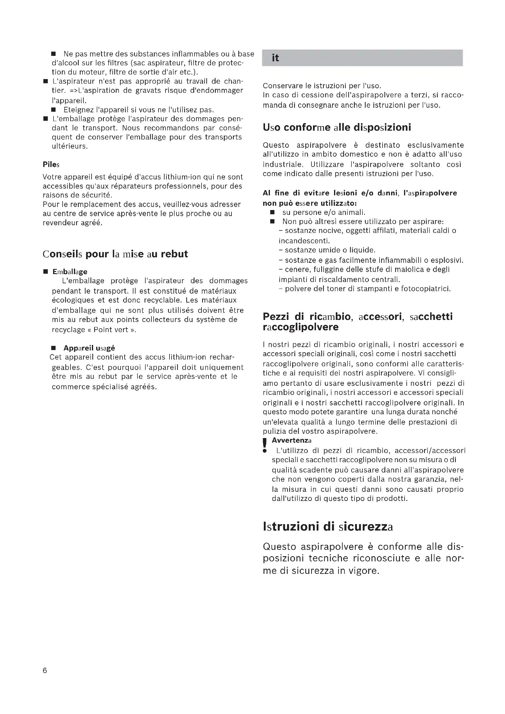 Conservare le istruzioni per l'uso. In caso di cessione dell'aspirapolvere a terzi, si racco- manda di consegnare anche le istruzioni per l'uso. Uso conforme alle disposizioni Questo aspirapolvere è destinato esclusivamente all'utilizzo in ambito domestico e non è adatto all'uso industriale. Utilizzare l'aspirapolvere soltanto così come indicato dalle presenti istruzioni per l'uso. Al fine di evitare lesioni e/o danni, l'aspirapolvere non può essere utilizzato: su persone e/o animali. Non può altresì essere utilizzato per aspirare: − sostanze nocive, oggetti affilati, materiali caldi o incandescenti. − sostanze umide o liquide. − sostanze e gas facilmente infiammabili o esplosivi. − cenere, fuliggine delle stufe di maiolica e degli impianti di riscaldamento centrali. − polvere del toner di stampanti e fotocopiatrici. Pezzi di ricambio, accessori, sacchetti raccoglipolvere I nostri pezzi di ricambio originali, i nostri accessori e accessori speciali originali, così come i nostri sacchetti raccoglipolvere originali, sono conformi alle caratteris- tiche e ai requisiti dei nostri aspirapolvere. Vi consigli- amo pertanto di usare esclusivamente i nostri pezzi di ricambio originali, i nostri accessori e accessori speciali originali e i nostri sacchetti raccoglipolvere originali. In questo modo potete garantire una lunga durata nonché un'elevata qualità a lungo termine delle prestazioni di pulizia del vostro aspirapolvere.