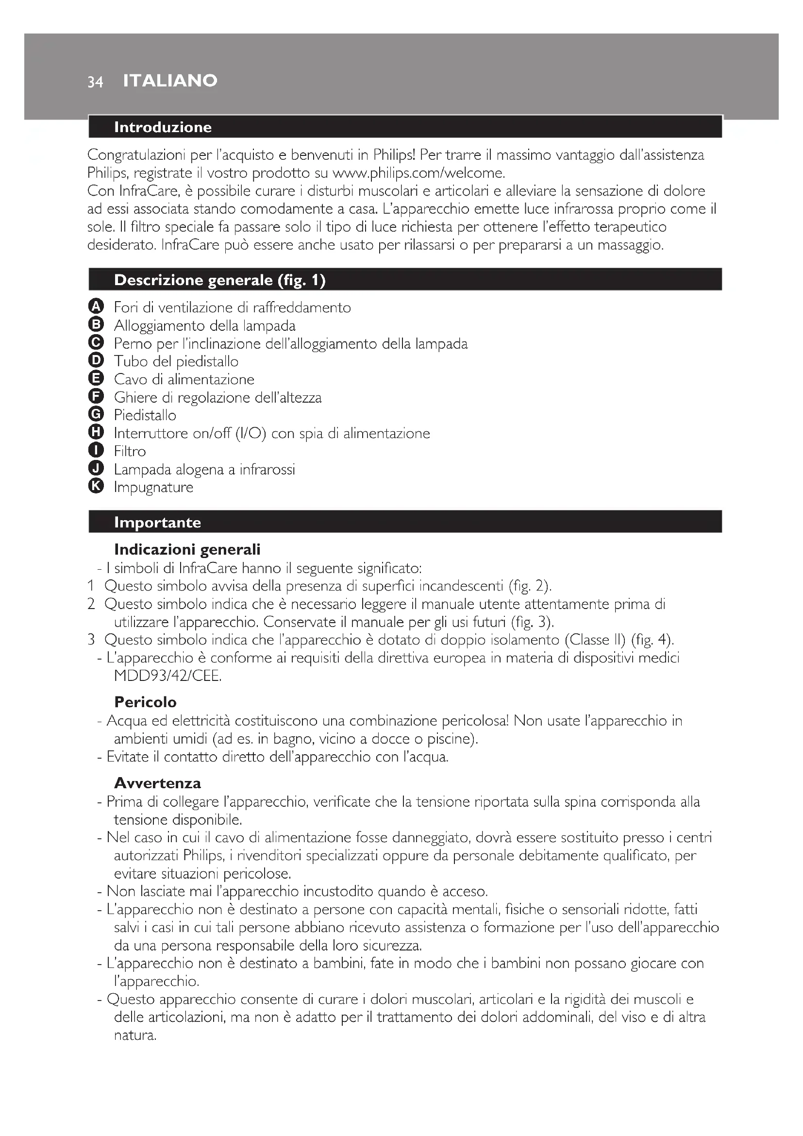 Congratulazioni per l’acquisto e benvenuti in Philips! Per trarre il massimo vantaggio dall’assistenza Philips, registrate il vostro prodotto su www.philips.com/welcome. Con InfraCare, è possibile curare i disturbi muscolari e articolari e alleviare la sensazione di dolore ad essi associata stando comodamente a casa. L’apparecchio emette luce infrarossa proprio come il sole. Il ltro speciale fa passare solo il tipo di luce richiesta per ottenere l’effetto terapeutico desiderato. InfraCare può essere anche usato per rilassarsi o per prepararsi a un massaggio.