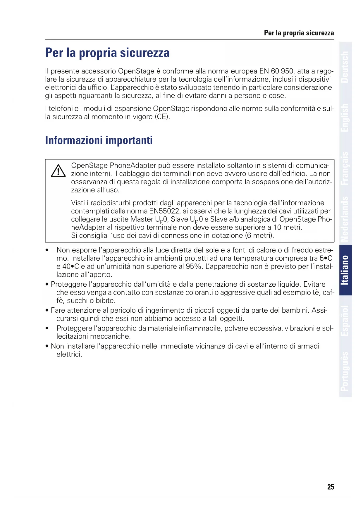 OpenStage PhoneAdapter può essere installato soltanto in sistemi di comunità interni. Il cablaggio dei terminali non deve ovvero uscire dall'edificio. La non osservanza di但这a regola di installatione comporta la sospensione dell'autorizzazione all'uso.