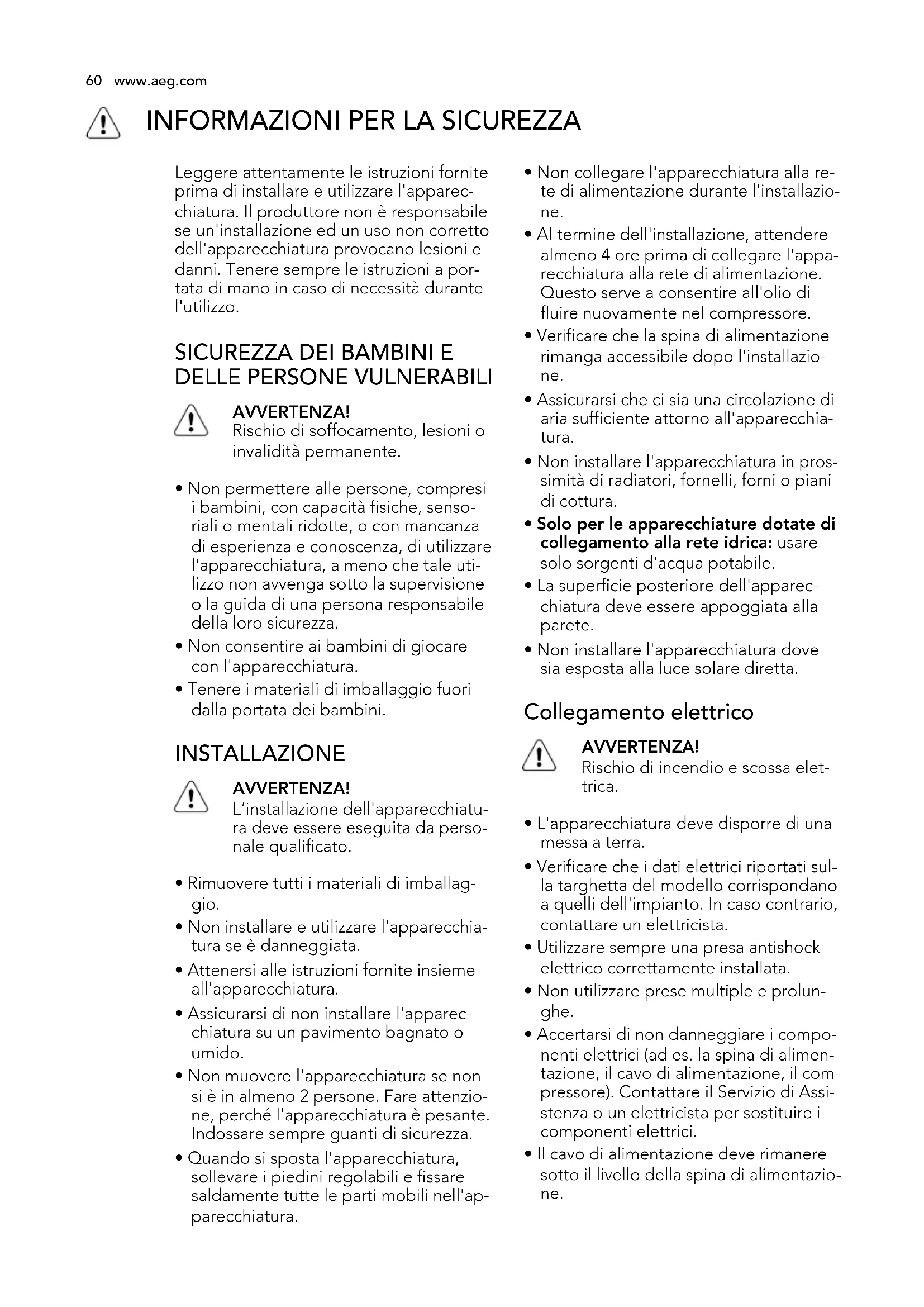 Consigliamo sempre l’impiego di ricambi originali. Quando si contatta l'Assistenza, accertarsi di disporre dei seguenti dati. Le informazioni si trovano sulla targhetta di identicazione. Modello, numero dell'apparecchio (PNC), numero di serie. Avvertenza - Importanti informazioni di sicurezza. Informazioni e consigli generali Informazioni in materia di sicurezza ambientale Con riserva di modiche.60 www.aeg.com