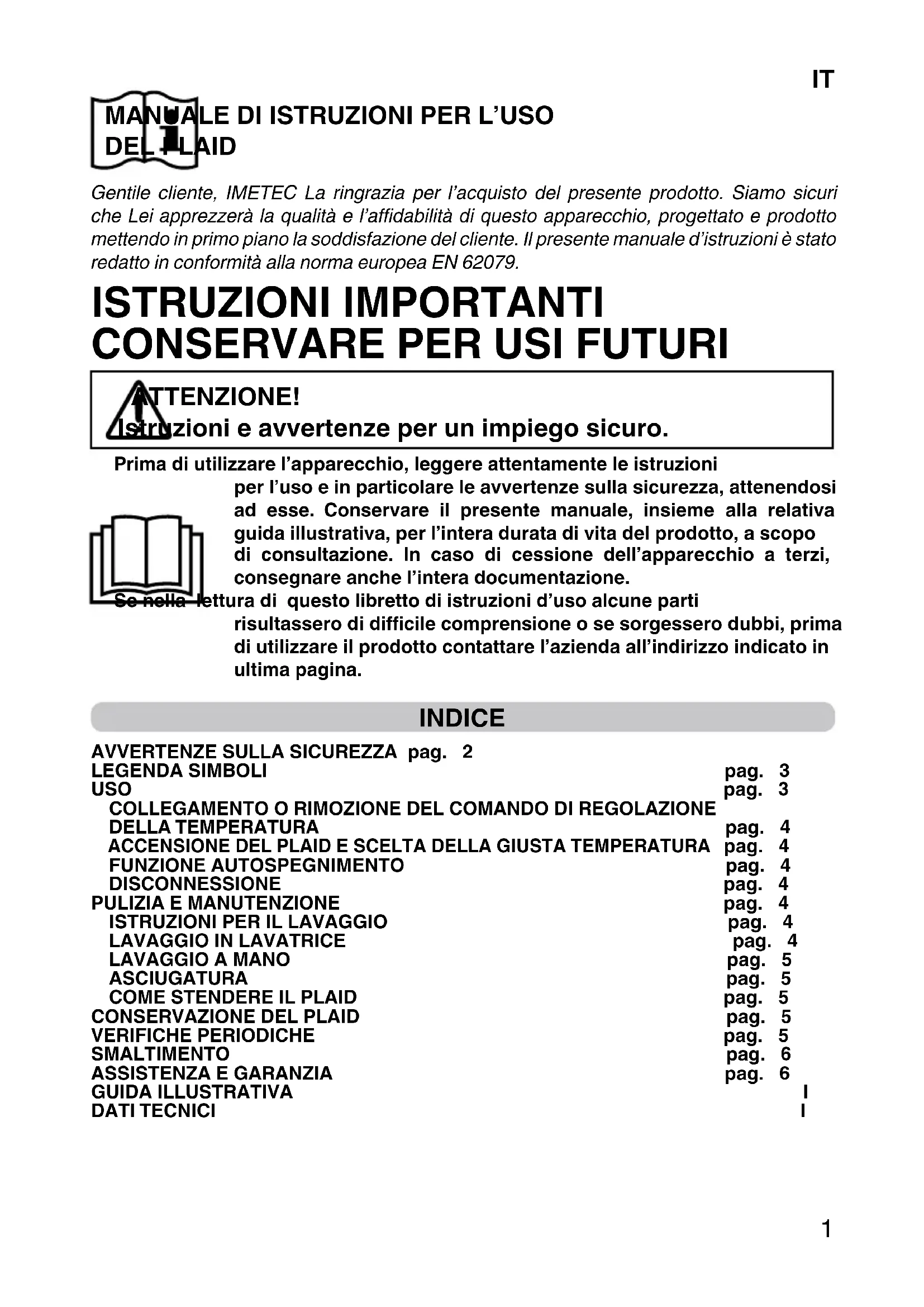 DEL PLAID Gentile cliente, IMETEC La ringrazia per l’acquisto del presente prodotto. Siamo sicuri che Lei apprezzerà la qualità e l’affidabilità di questo apparecchio, progettato e prodotto mettendo in primo piano la soddisfazione del cliente. Il presente manuale d’istruzioni è stato redatto in conformità alla norma europea EN 62079. ISTRUZIONI IMPORTANTI