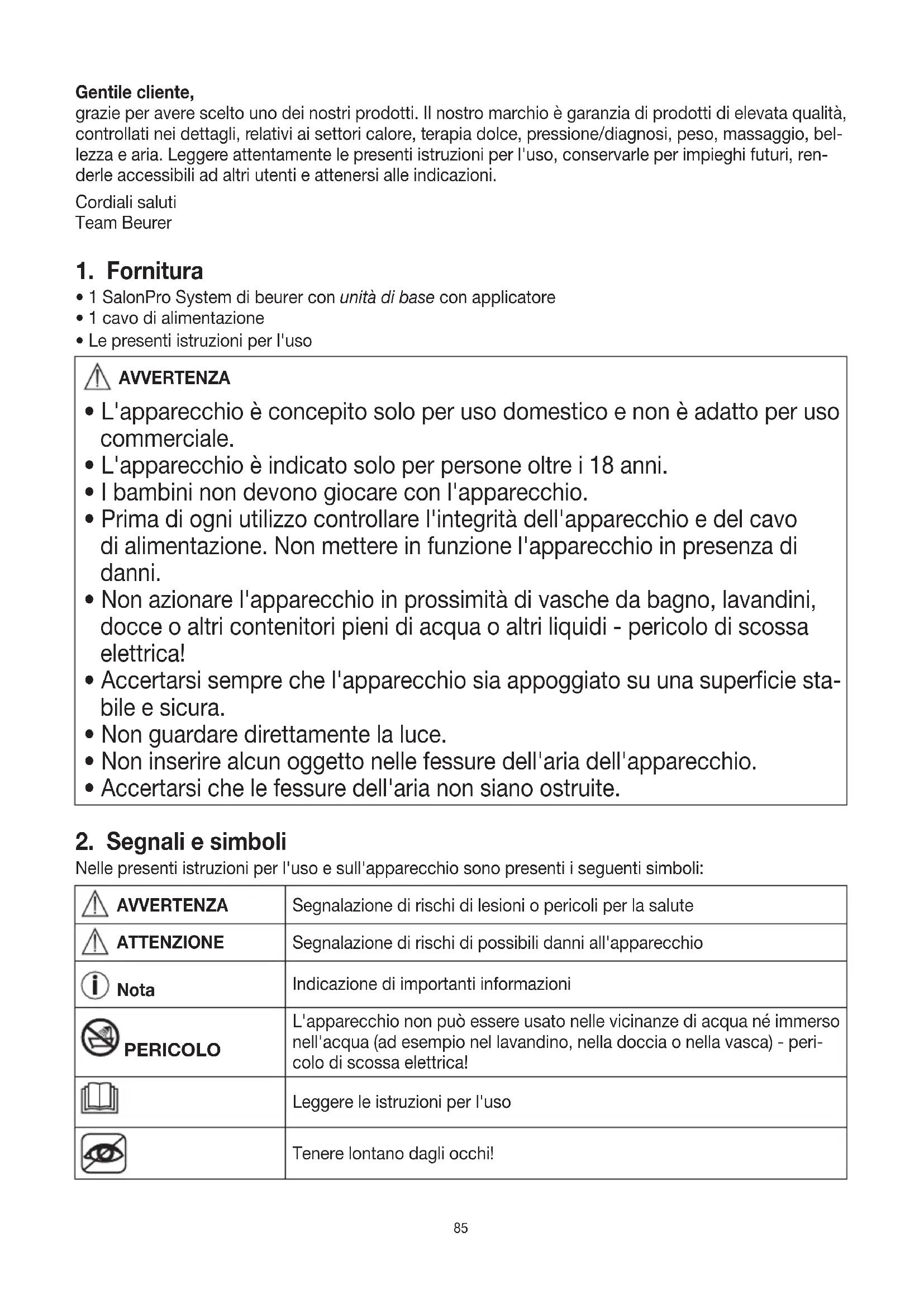 AVVERTENZA Prima di utilizzare l'apparecchio leggere attentamente le istruzioni per l'uso e rispettarle durante l'uti- lizzo di SalonPro System di beurer. Il mancato rispetto delle seguenti indicazioni può causare lesioni o danni materiali. Conservare le istruzioni per l'uso e fare in modo che siano accessibili anche agli altri utilizzatori. Accertarsi di consegnare anche le presenti istruzioni per l'uso quando l'apparecchio viene dato a terzi.