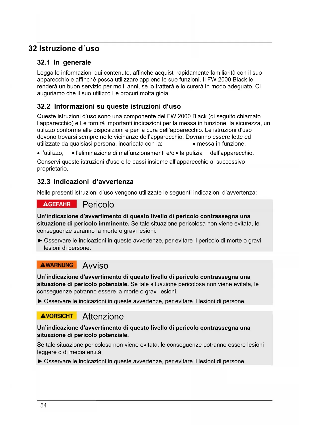 Nelle presenti istruzioni d’uso vengono utilizzate le seguenti indicazioni d’avvertenza: Pericolo Un’indicazione d'avvertimento di questo livello di pericolo contrassegna una situazione di pericolo imminente. Se tale situazione pericolosa non viene evitata, le conseguenze saranno la morte o gravi lesioni. ► Osservare le indicazioni in queste avvertenze, per evitare il pericolo di morte o gravi lesioni di persone. Avviso Un’indicazione d'avvertimento di questo livello di pericolo contrassegna una situazione di pericolo potenziale. Se tale situazione pericolosa non viene evitata, le conseguenze potranno essere la morte o gravi lesioni. ► Osservare le indicazioni in queste avvertenze, per evitare il lesioni di persone. Attenzione Un’indicazione d'avvertimento di questo livello di pericolo contrassegna una situazione di pericolo potenziale. Se tale situazione pericolosa non viene evitata, le conseguenze potranno essere lesioni leggere o di media entità. ► Osservare le indicazioni in queste avvertenze, per evitare il lesioni di persone.55 Indicazione Un indicazione contrassegna inoltre delle informazioni, che facilitano l’utilizzo della macchina. 33 Sicurezza In questo capitolo riceverà importanti indicazioni sulla sicurezza nell’utilizzo dell’apparecchio. Questo apparecchio corrisponde alle disposizioni di sicurezza prescritte. Un utilizzo inadeguato può però provocare danni a persone e cose.