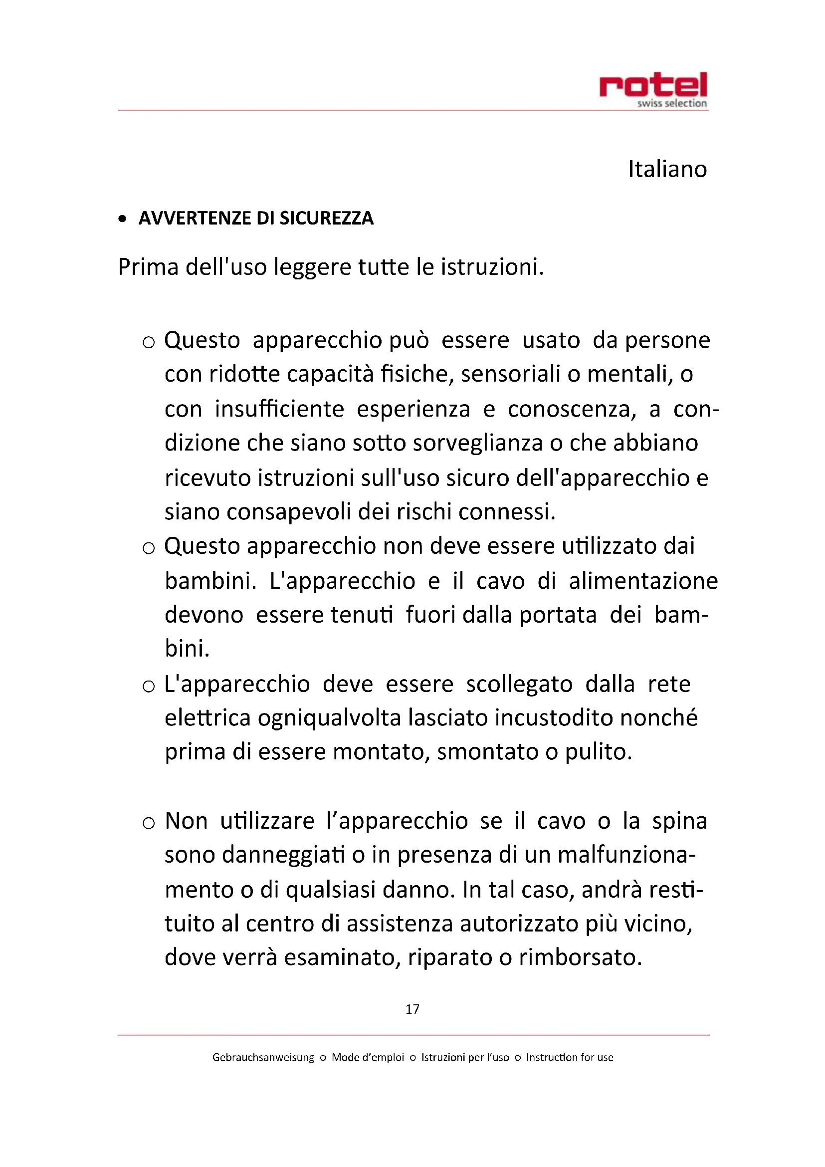 Prima dell'uso leggere tutte le istruzioni. o Questo apparecchio può essere usato da persone con ridotte capacità fisiche, sensoriali o mentali, o con insufficiente esperienza e conoscenza, a con- dizione che siano sotto sorveglianza o che abbiano ricevuto istruzioni sull'uso sicuro dell'apparecchio e siano consapevoli dei rischi connessi. o Questo apparecchio non deve essere utilizzato dai bambini. L'apparecchio e il cavo di alimentazione devono essere tenuti fuori dalla portata dei bam- bini. o L'apparecchio deve essere scollegato dalla rete elettrica ogniqualvolta lasciato incustodito nonché prima di essere montato, smontato o pulito. o Non utilizzare l’apparecchio se il cavo o la spina sono danneggiati o in presenza di un malfunziona- mento o di qualsiasi danno. In tal caso, andrà resti- tuito al centro di assistenza autorizzato più vicino, dove verrà esaminato, riparato o rimborsato.Gebrauchsanweisung ○ Mode d’emploi ○ Istruzioni per l’uso ○ Instruction for use