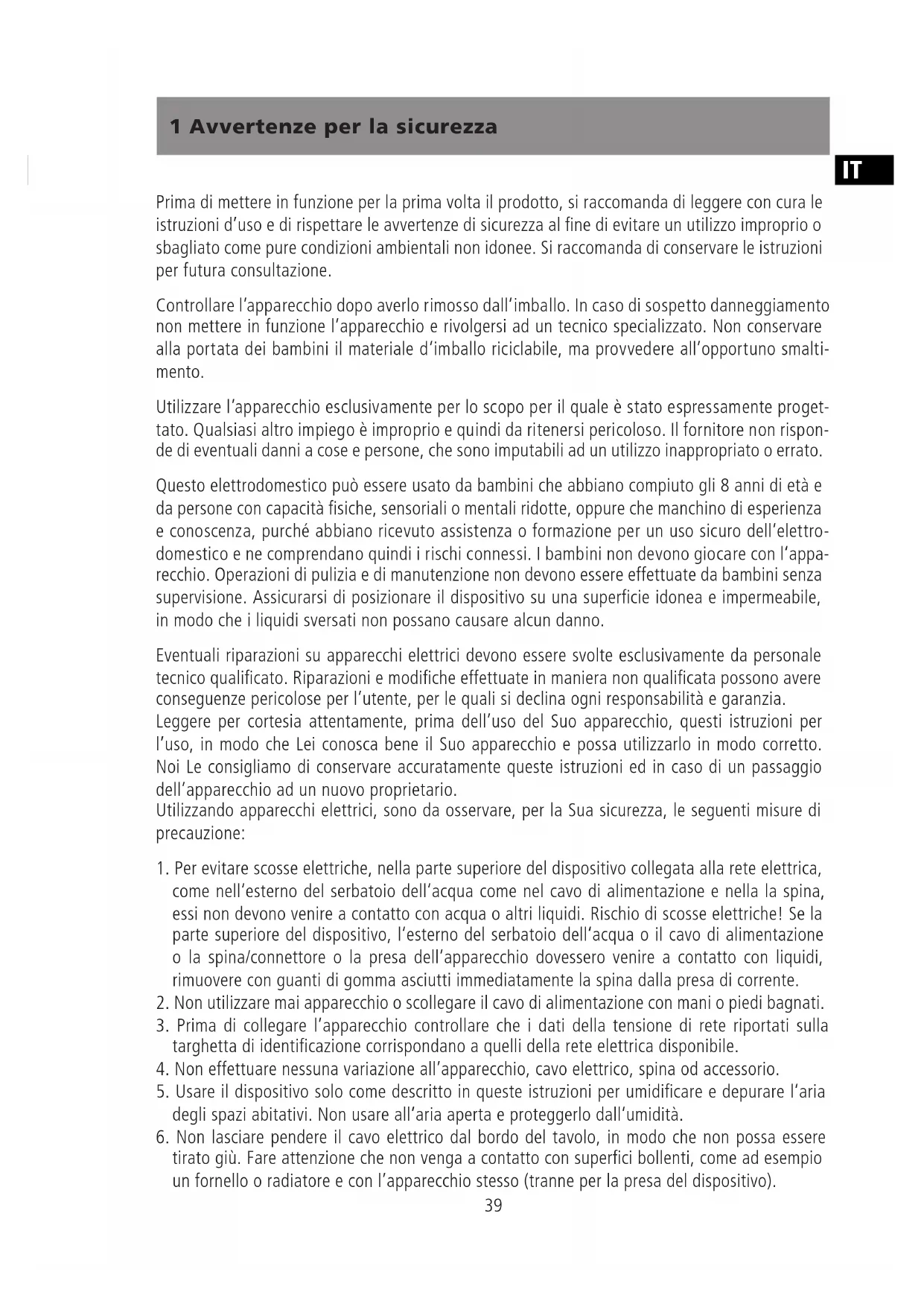 Prima di mettere in funzione per la prima volta il prodotto, si raccomanda di leggere con cura le istruzioni d’uso e di rispettare le avvertenze di sicurezza al fine di evitare un utilizzo improprio o sbagliato come pure condizioni ambientali non idonee. Si raccomanda di conservare le istruzioni per futura consultazione. Controllare l’apparecchio dopo averlo rimosso dall’imballo. In caso di sospetto danneggiamento non mettere in funzione l’apparecchio e rivolgersi ad un tecnico specializzato. Non conservare alla portata dei bambini il materiale d’imballo riciclabile, ma provvedere all’opportuno smalti- mento. Utilizzare l’apparecchio esclusivamente per lo scopo per il quale è stato espressamente proget- tato. Qualsiasi altro impiego è improprio e quindi da ritenersi pericoloso. Il fornitore non rispon- de di eventuali danni a cose e persone, che sono imputabili ad un utilizzo inappropriato o errato. Questo elettrodomestico può essere usato da bambini che abbiano compiuto gli 8 anni di età e da persone con capacità fisiche, sensoriali o mentali ridotte, oppure che manchino di esperienza e conoscenza, purché abbiano ricevuto assistenza o formazione per un uso sicuro dell‘elettro- domestico e ne comprendano quindi i rischi connessi. I bambini non devono giocare con l‘appa- recchio. Operazioni di pulizia e di manutenzione non devono essere effettuate da bambini senza supervisione. Assicurarsi di posizionare il dispositivo su una superficie idonea e impermeabile, in modo che i liquidi sversati non possano causare alcun danno. Eventuali riparazioni su apparecchi elettrici devono essere svolte esclusivamente da personale tecnico qualificato. Riparazioni e modifiche effettuate in maniera non qualificata possono avere conseguenze pericolose per l’utente, per le quali si declina ogni responsabilità e garanzia. Leggere per cortesia attentamente, prima dell’uso del Suo apparecchio, questi istruzioni per l’uso, in modo che Lei conosca bene il Suo apparecchio e possa utilizzarlo in modo corretto. Noi Le consigliamo di conservare accuratamente queste istruzioni ed in caso di un passaggio dell’apparecchio ad un nuovo proprietario. Utilizzando apparecchi elettrici, sono da osservare, per la Sua sicurezza, le seguenti misure di precauzione: