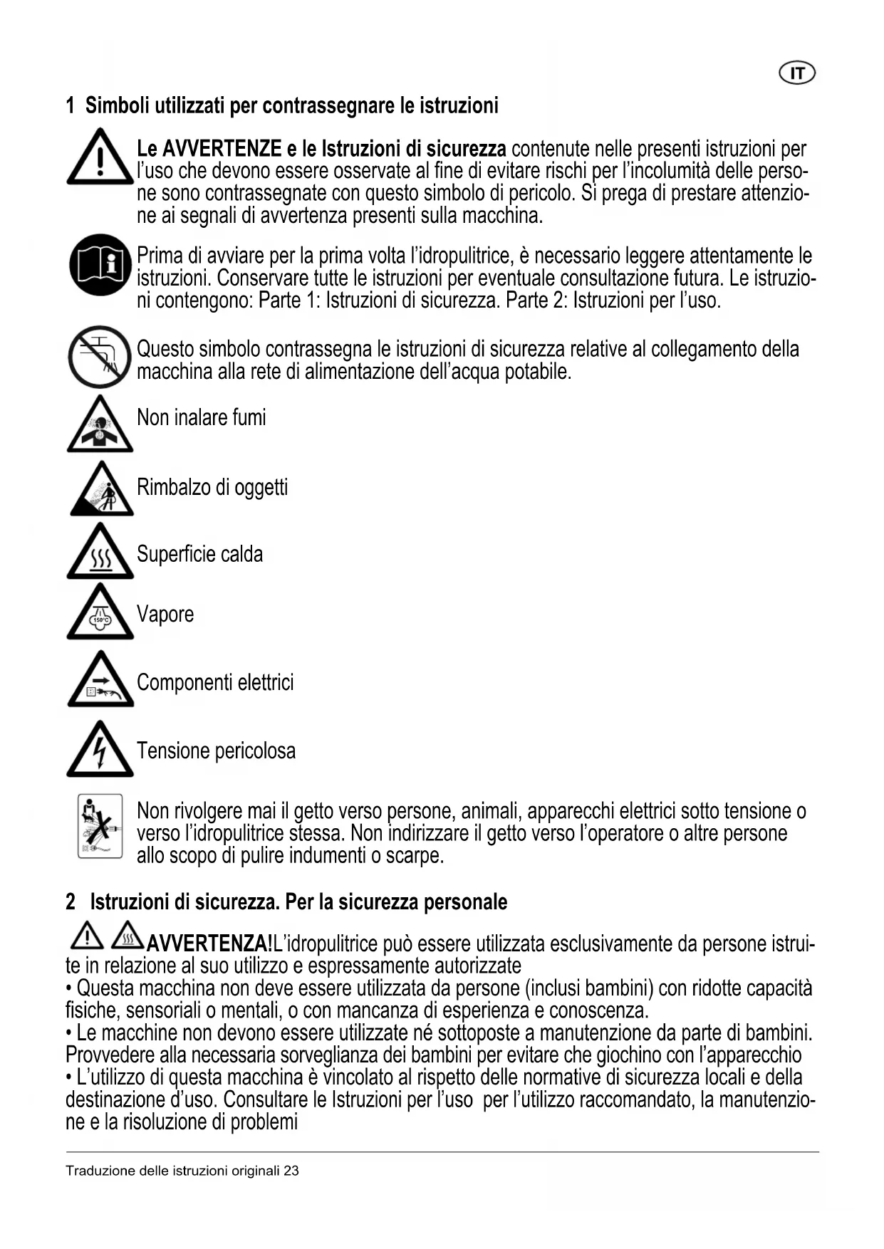 - Indien de voedingskabel beschadigd is, moet deze worden vervangen door de fabrikant, zijn servicewerkplaats of een vergelijkbaar gekwalificeerd persoon om gevaarlijke situaties te voor- komen.Traduzione delle istruzioni originali 23 1 Simboli utilizzati per contrassegnare le istruzioni Le AVVERTENZE e le Istruzioni di sicurezza contenute nelle presenti istruzioni per l’uso che devono essere osservate al fine di evitare rischi per l’incolumità delle perso- ne sono contrassegnate con questo simbolo di pericolo. Si prega di prestare attenzio- ne ai segnali di avvertenza presenti sulla macchina. Prima di avviare per la prima volta l’idropulitrice, è necessario leggere attentamente le istruzioni. Conservare tutte le istruzioni per eventuale consultazione futura. Le istruzio- ni contengono: Parte 1: Istruzioni di sicurezza. Parte 2: Istruzioni per l’uso. Questo simbolo contrassegna le istruzioni di sicurezza relative al collegamento della macchina alla rete di alimentazione dell’acqua potabile. Non inalare fumi Rimbalzo di oggetti Superficie calda Vapore Componenti elettrici Tensione pericolosa Non rivolgere mai il getto verso persone, animali, apparecchi elettrici sotto tensione o verso l’idropulitrice stessa. Non indirizzare il getto verso l’operatore o altre persone allo scopo di pulire indumenti o scarpe. 2 Istruzioni di sicurezza. Per la sicurezza personale AVVERTENZA!L’idropulitrice può essere utilizzata esclusivamente da persone istrui- te in relazione al suo utilizzo e espressamente autorizzate