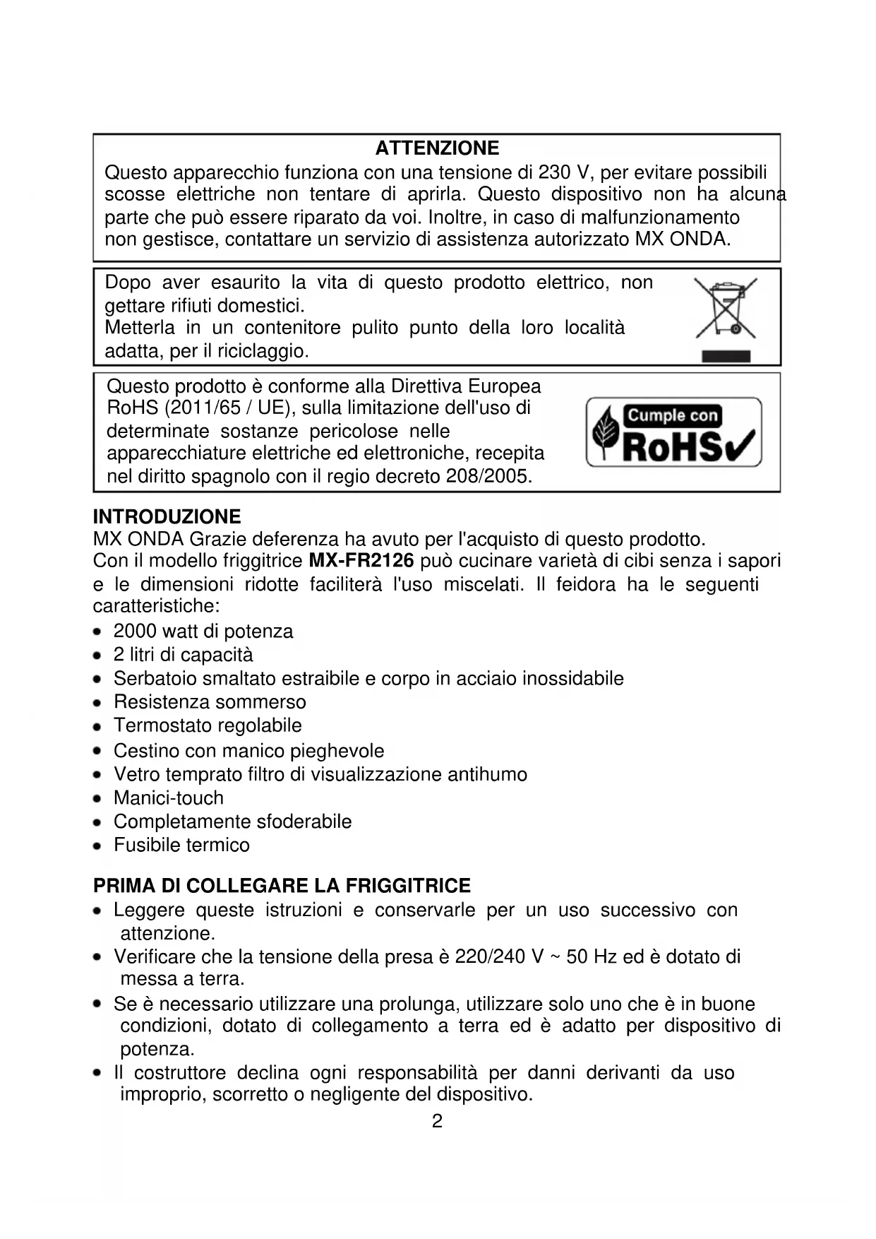 MXFR2126 - Friggitrice Mx Onda - Manuale utente e istruzioni gratuiti