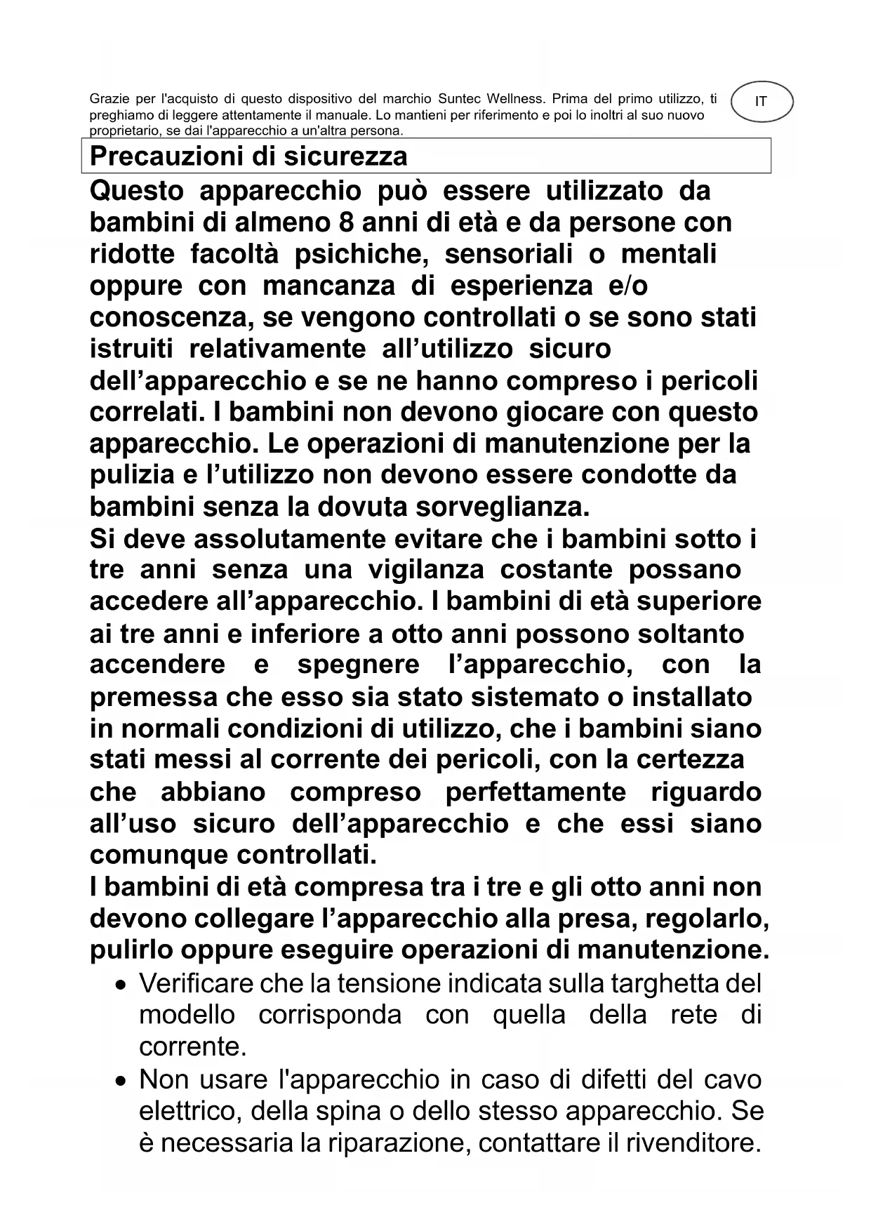 CoolBreeze SUNTEC WELLNESS GMBH / HOLZSTRASSE 2 / 40 221 DÜSSELDORF / ALLEMAGNEGrazie per l'acquisto di questo dispositivo del marchio Suntec Wellness. Prima del primo utilizzo, ti preghiamo di leggere attentamente il manuale. Lo mantieni per riferimento e poi lo inoltri al suo nuovo proprietario, se dai l'apparecchio a un'altra persona. Precauzioni di sicurezza Questo apparecchio può essere utilizzato da bambini di almeno 8 anni di età e da persone con ridotte facoltà psichiche, sensoriali o mentali oppure con mancanza di esperienza e/o conoscenza, se vengono controllati o se sono stati istruiti relativamente all’utilizzo sicuro dell’apparecchio e se ne hanno compreso i pericoli correlati. I bambini non devono giocare con questo apparecchio. Le operazioni di manutenzione per la pulizia e l’utilizzo non devono essere condotte da bambini senza la dovuta sorveglianza. Si deve assolutamente evitare che i bambini sotto i tre anni senza una vigilanza costante possano accedere all’apparecchio. I bambini di età superiore ai tre anni e inferiore a otto anni possono soltanto accendere e spegnere l’apparecchio, con la premessa che esso sia stato sistemato o installato in normali condizioni di utilizzo, che i bambini siano stati messi al corrente dei pericoli, con la certezza che abbiano compreso perfettamente riguardo all’uso sicuro dell’apparecchio e che essi siano comunque controllati. I bambini di età compresa tra i tre e gli otto anni non devono collegare l’apparecchio alla presa, regolarlo, pulirlo oppure eseguire operazioni di manutenzione.