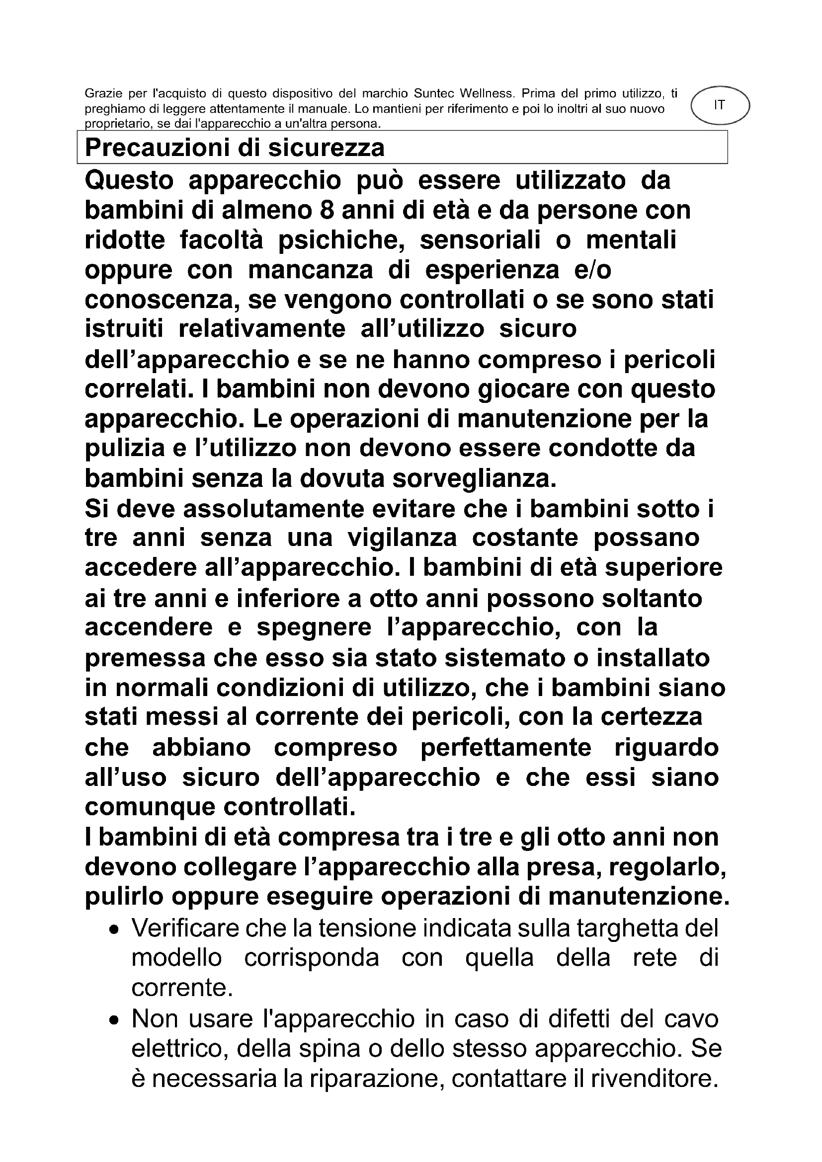CoolBreeze SUNTEC WELLNESS GMBH / HOLZSTRASSE 2 / 40 221 DÜSSELDORF / ALLEMAGNEGrazie per l'acquisto di questo dispositivo del marchio Suntec Wellness. Prima del primo utilizzo, ti preghiamo di leggere attentamente il manuale. Lo mantieni per riferimento e poi lo inoltri al suo nuovo proprietario, se dai l'apparecchio a un'altra persona. Precauzioni di sicurezza Questo apparecchio può essere utilizzato da bambini di almeno 8 anni di età e da persone con ridotte facoltà psichiche, sensoriali o mentali oppure con mancanza di esperienza e/o conoscenza, se vengono controllati o se sono stati istruiti relativamente all’utilizzo sicuro dell’apparecchio e se ne hanno compreso i pericoli correlati. I bambini non devono giocare con questo apparecchio. Le operazioni di manutenzione per la pulizia e l’utilizzo non devono essere condotte da bambini senza la dovuta sorveglianza. Si deve assolutamente evitare che i bambini sotto i tre anni senza una vigilanza costante possano accedere all’apparecchio. I bambini di età superiore ai tre anni e inferiore a otto anni possono soltanto accendere e spegnere l’apparecchio, con la premessa che esso sia stato sistemato o installato in normali condizioni di utilizzo, che i bambini siano stati messi al corrente dei pericoli, con la certezza che abbiano compreso perfettamente riguardo all’uso sicuro dell’apparecchio e che essi siano comunque controllati. I bambini di età compresa tra i tre e gli otto anni non devono collegare l’apparecchio alla presa, regolarlo, pulirlo oppure eseguire operazioni di manutenzione.
