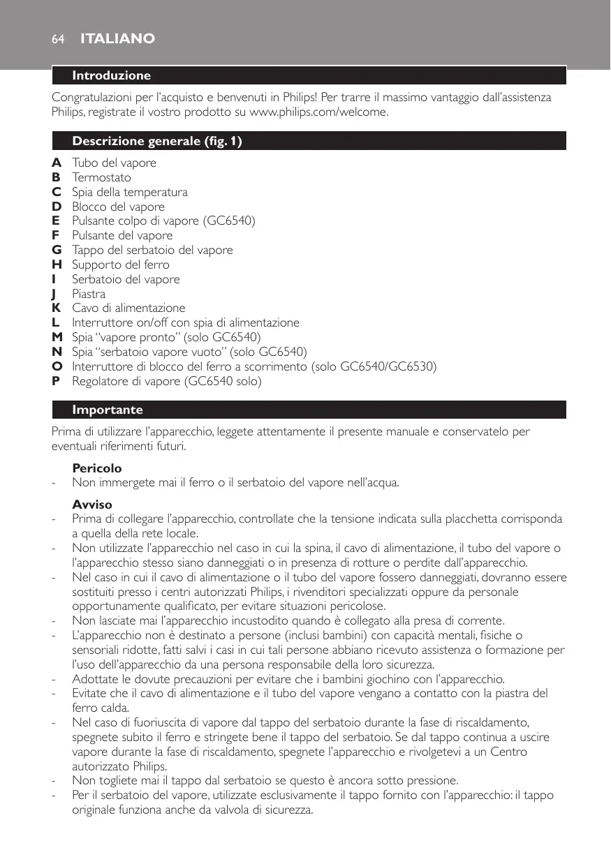 GC-6510 - Ferro da stiro PHILIPS - Manuale utente e istruzioni gratuiti