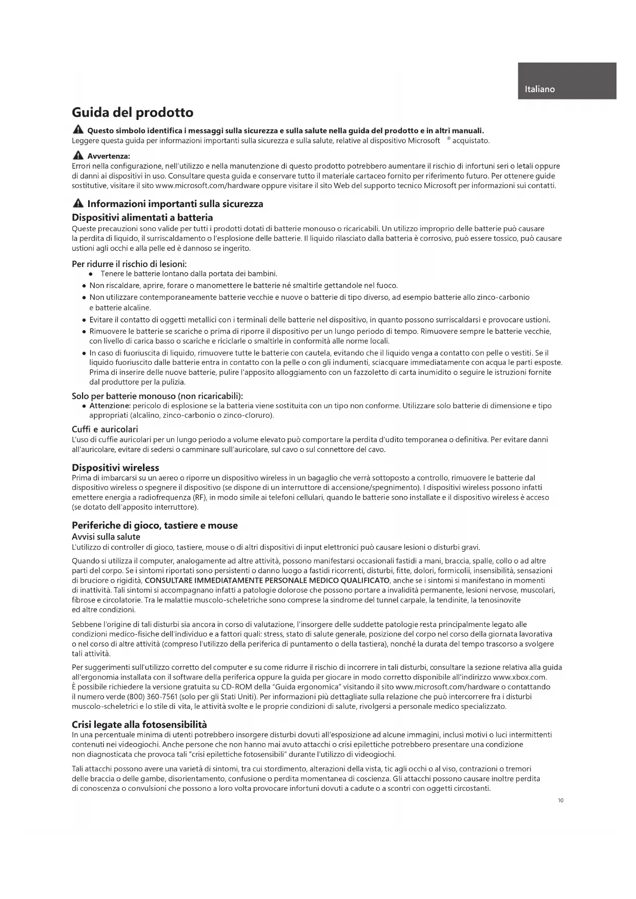 acquistato. Avvertenza: Errori nella confi gurazione, nell'utilizzo e nella manutenzione di questo prodotto potrebbero aumentare il rischio di infortuni seri o letali oppure di danni ai dispositivi in uso. Consultare questa guida e conservare tutto il materiale cartaceo fornito per riferimento futuro. Per ottenere guide sostitutive, visitare il sito www.microsoft.com/hardware oppure visitare il sito Web del supporto tecnico Microsoft per informazioni sui contatti. Informazioni importanti sulla sicurezza Dispositivi alimentati a batteria Queste precauzioni sono valide per tutti i prodotti dotati di batterie monouso o ricaricabili. Un utilizzo improprio delle batterie può causare la perdita di liquido, il surriscaldamento o l'esplosione delle batterie. Il liquido rilasciato dalla batteria è corrosivo, può essere tossico, può causare ustioni agli occhi e alla pelle ed è dannoso se ingerito. Per ridurre il rischio di lesioni: ● Tenere le batterie lontano dalla portata dei bambini. ● Non riscaldare, aprire, forare o manomettere le batterie né smaltirle gettandole nel fuoco. ● Non utilizzare contemporaneamente batterie vecchie e nuove o batterie di tipo diverso, ad esempio batterie allo zinco-carbonio e batterie alcaline. ● Evitare il contatto di oggetti metallici con i terminali delle batterie nel dispositivo, in quanto possono surriscaldarsi e provocare ustioni. ● Rimuovere le batterie se scariche o prima di riporre il dispositivo per un lungo periodo di tempo. Rimuovere sempre le batterie vecchie, con livello di carica basso o scariche e riciclarle o smaltirle in conformità alle norme locali. ● In caso di fuoriuscita di liquido, rimuovere tutte le batterie con cautela, evitando che il liquido venga a contatto con pelle o vestiti. Se il liquido fuoriuscito dalle batterie entra in contatto con la pelle o con gli indumenti, sciacquare immediatamente con acqua le parti esposte. Prima di inserire delle nuove batterie, pulire l'apposito alloggiamento con un fazzoletto di carta inumidito o seguire le istruzioni fornite dal produttore per la pulizia. Solo per batterie monouso (non ricaricabili): ● Attenzione: pericolo di esplosione se la batteria viene sostituita con un tipo non conforme. Utilizzare solo batterie di dimensione e tipo appropriati (alcalino, zinco-carbonio o zinco-cloruro). Cuffi e auricolari L'uso di cuffi e auricolari per un lungo periodo a volume elevato può comportare la perdita d'udito temporanea o defi nitiva. Per evitare danni all'auricolare, evitare di sedersi o camminare sull'auricolare, sul cavo o sul connettore del cavo. Dispositivi wireless Prima di imbarcarsi su un aereo o riporre un dispositivo wireless in un bagaglio che verrà sottoposto a controllo, rimuovere le batterie dal dispositivo wireless o spegnere il dispositivo (se dispone di un interruttore di accensione/spegnimento). I dispositivi wireless possono infatti emettere energia a radiofrequenza (RF), in modo simile ai telefoni cellulari, quando le batterie sono installate e il dispositivo wireless è acceso (se dotato dell'apposito interruttore). Periferiche di gioco, tastiere e mouse Avvisi sulla salute L'utilizzo di controller di gioco, tastiere, mouse o di altri dispositivi di input elettronici può causare lesioni o disturbi gravi. Quando si utilizza il computer, analogamente ad altre attività, possono manifestarsi occasionali fastidi a mani, braccia, spalle, collo o ad altre parti del corpo. Se i sintomi riportati sono persistenti o danno luogo a fastidi ricorrenti, disturbi, fi tte, dolori, formicolii, insensibilità, sensazioni di bruciore o rigidità, CONSULTARE IMMEDIATAMENTE PERSONALE MEDICO QUALIFICATO, anche se i sintomi si manifestano in momenti di inattività. Tali sintomi si accompagnano infatti a patologie dolorose che possono portare a invalidità permanente, lesioni nervose, muscolari, fi brose e circolatorie. Tra le malattie muscolo-scheletriche sono comprese la sindrome del tunnel carpale, la tendinite, la tenosinovite ed altre condizioni. Sebbene l'origine di tali disturbi sia ancora in corso di valutazione, l'insorgere delle suddette patologie resta principalmente legato alle condizioni medico-fi siche dell'individuo e a fattori quali: stress, stato di salute generale, posizione del corpo nel corso della giornata lavorativa o nel corso di altre attività (compreso l'utilizzo della periferica di puntamento o della tastiera), nonché la durata del tempo trascorso a svolgere tali attività. Per suggerimenti sull'utilizzo corretto del computer e su come ridurre il rischio di incorrere in tali disturbi, consultare la sezione relativa alla guida all'ergonomia installata con il software della periferica oppure la guida per giocare in modo corretto disponibile all'indirizzo www.xbox.com. È possibile richiedere la versione gratuita su CD-ROM della “Guida ergonomica” visitando il sito www.microsoft.com/hardware o contattando il numero verde (800) 360-7561 (solo per gli Stati Uniti). Per informazioni più dettagliate sulla relazione che può intercorrere fra i disturbi muscolo-scheletrici e lo stile di vita, le attività svolte e le proprie condizioni di salute, rivolgersi a personale medico specializzato. Crisi legate alla fotosensibilità In una percentuale minima di utenti potrebbero insorgere disturbi dovuti all'esposizione ad alcune immagini, inclusi motivi o luci intermittenti contenuti nei videogiochi. Anche persone che non hanno mai avuto attacchi o crisi epilettiche potrebbero presentare una condizione non diagnosticata che provoca tali “crisi epilettiche fotosensibili” durante l'utilizzo di videogiochi. Tali attacchi possono avere una varietà di sintomi, tra cui stordimento, alterazioni della vista, tic agli occhi o al viso, contrazioni o tremori delle braccia o delle gambe, disorientamento, confusione o perdita momentanea di coscienza. Gli attacchi possono causare inoltre perdita di conoscenza o convulsioni che possono a loro volta provocare infortuni dovut