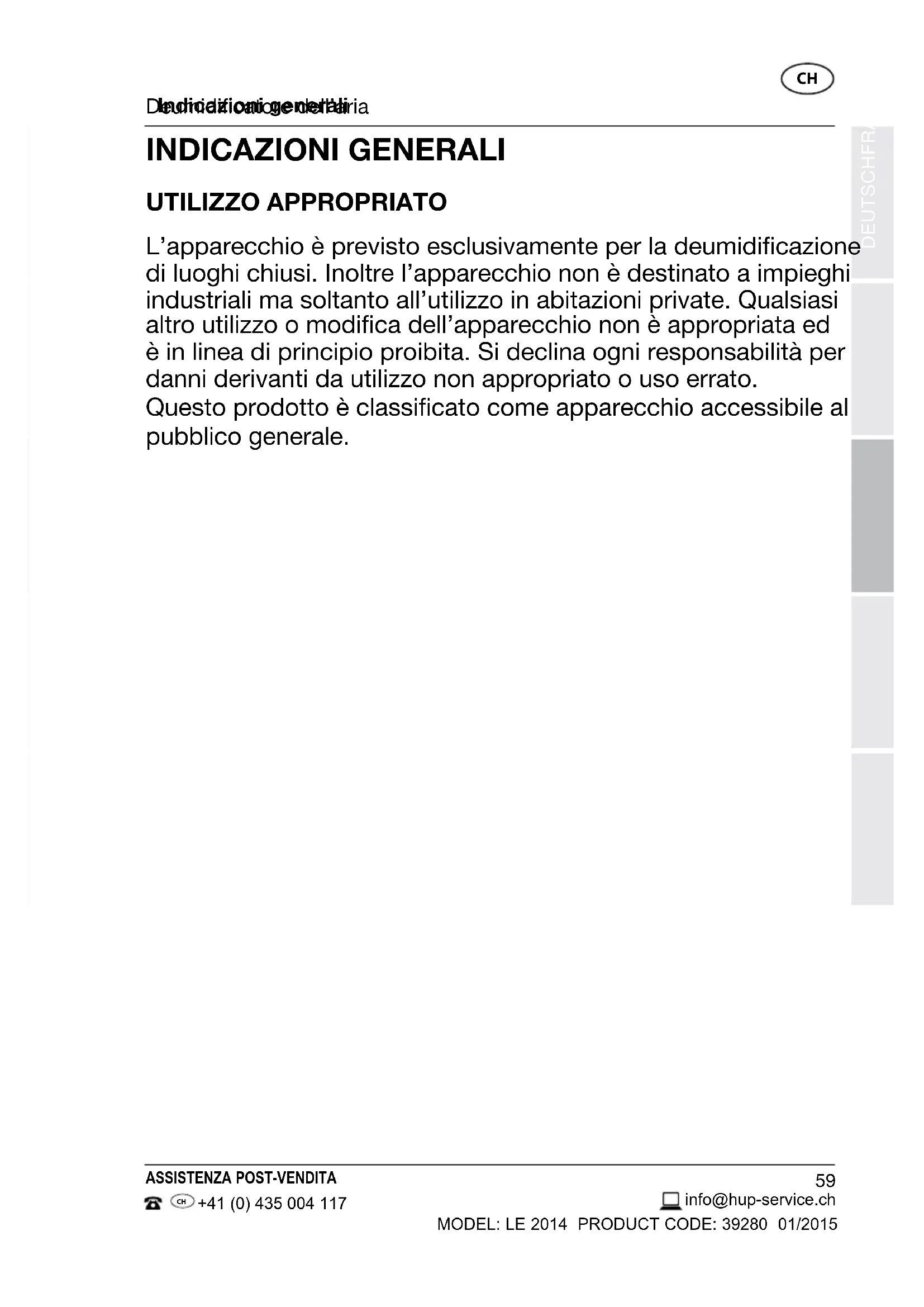 +41 (0) 435 004 117 ASSISTENZA POST-VENDITA info@hup-service.chMODEL: LE 2014 PRODUCT CODE: 39280 01/2015 Garanzia GARANZIA CONDIZIONI DI GARANZIA (CH) Il periodo di garanzia ha una durata di 3 anni e inizia il giorno dell’acqui- sto o della consegna della merce. Perché i diritti di garanzia abbiano validità è assolutamente necessario presentare lo scontrino relativo all’ac- quisto e compilare la scheda della garanzia. Conservare quindi sia lo scontrino che la scheda della garanzia! Il produttore garantisce la risoluzione gratuita di vizi riconducibili a difetti di materiale o di fabbricazione attraverso la riparazione, la sostituzione o il rimborso, a discrezione del produttore stesso. La garanzia non si estende a danni causati da incidenti, eventi imprevisti (problemi causati da fulmi- ni, acqua, fuoco, ecc.), uso o trasporto non conforme, mancato rispetto delle prescrizioni di sicurezza e/o di manutenzione o da altro tipo di uso o modifiche diversi da quelli conformi. Il periodo di garanzia per i componenti soggetti ad usura e le parti di con- sumo in caso di utilizzo normale e conforme (ad es. lampade, batterie, pneumatici, ecc.) dura 6 mesi. Le conseguenze dell’utilizzo quotidiano (graffi, ammaccature) non sono coperte da garanzia. L’obbligo di garanzia da parte del rivenditore stabilito per legge non viene limitato dalla presente garanzia. Il periodo di garanzia può essere esteso soltanto se una norma di legge lo prevede. Nei paesi nei quali la legge prescrive una garanzia (obbligatoria) e/o una disponibilità a magazzino di ricambi e/o una regolamentazione per il rimborso dei danni, valgono le condizioni minime stabilite dalla legge. Il servizio assistenza e il rivenditore non sono in alcun modo responsabili in caso di riparazione per eventuali dati o impostazioni salvate sul prodotto dall’utente. Anche dopo la scadenza del periodo di garanzia è possibile inviare gli apparecchi difettosi al servizio di assistenza a scopo di riparazione. In questo caso i lavori di riparazione verranno effettuati a pagamento. Nel caso in cui la riparazione o il preventivo non fossero gratuiti, verrete infor- mati in anticipo. Gentile cliente, il 95% circa dei reclami è purtroppo da ricondursi a errori di utilizzo e potrebbe pertanto essere evitato senza problemi: basta contattare telefonicamente, per e-mail o per fax l’apposito servizio di assistenza. Desideriamo quindi invitarla a rivolgersi alla hotline da noi messa a diposizione prima di restituire l’apparecchio ovvero riportarlo al negozio dove è stato acquistato. La potremo così aiutare senza che si debba rivolgere altrove.DEUTSCHFRANÇAISITALIANOMAGYARSLOVENŠČINA