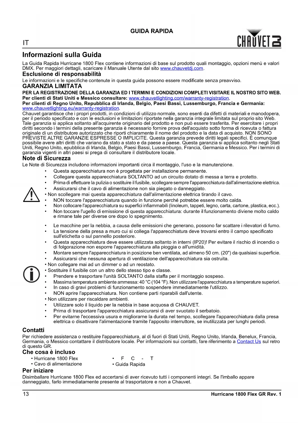 Chauvet garantisce che i propri prodotti, in condizioni di utilizzo normale, sono esenti da difetti di materiali e manodopera, per il periodo specificato e con le esclusioni e limitazioni riportate nella garanzia integrale limitata sul proprio sito Web. Tale garanzia si applica soltanto all'acquirente originario del prodotto e non può essere trasferita. Per esercitare i propri diritti secondo i termini della presente garanzia è necessario fornire prova dell'acquisto sotto forma di ricevuta o fattura originale di un distributore autorizzato che riporti chiaramente il nome del prodotto e la data di acquisto. NON SONO PREVISTE ALTRE GARANZIE ESPRESSE O IMPLICITE. Questa garanzia prevede diritti legali specifici. È comunque possibile avere altri diritti che variano da stato a stato e da paese a paese. Questa garanzia si applica soltanto negli Stati Uniti, Regno Unito, epubblica di Irlanda, Belgio, Paesi Bassi, Lussemburgo, Francia, Germania e Messico. Per i termini di garanzia vigenti in altri paesi si prega di consultare il distributore locale. Note di Sicurezza Le Note di Sicurezza includono informazioni importanti circa il montaggio, l'uso e la manutenzione. Contatti Per richiedere assistenza o restituire l'apparecchiatura, al di fuori di Stati Uniti, Regno Unito, Irlanda, Benelux, Francia, Germania, o Messico contattare il distributore locale. Per informazioni sui contatti, fare riferimento a Contact Us sul retro di questo GR. Che cosa è incluso Per iniziare Disimballare Hurricane 1800 Flex ed accertarsi di aver ricevuto tutti i componenti integri. Se l'imballo appare danneggiato, farlo immediatamente presente al trasportatore e non a Chauvet.