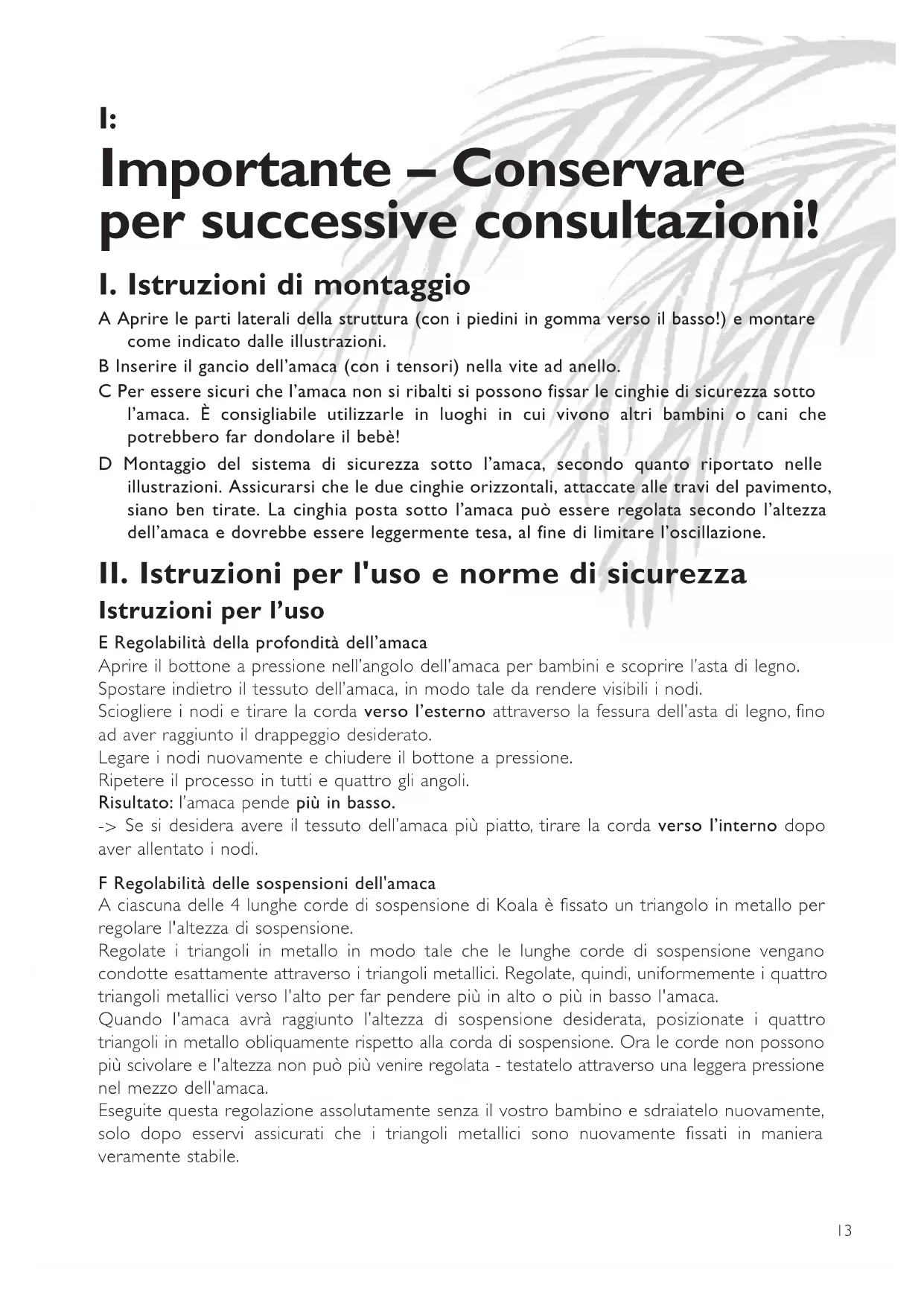 A Aprire le parti laterali della struttura (con i piedini in gomma verso il basso!) e montare come indicato dalle illustrazioni. B Inserire il gancio dell’amaca (con i tensori) nella vite ad anello. C Per essere sicuri che l’amaca non si ribalti si possono fissar le cinghie di sicurezza sotto l’amaca. È consigliabile utilizzarle in luoghi in cui vivono altri bambini o cani che potrebbero far dondolare il bebè! D Montaggio del sistema di sicurezza sotto l’amaca, secondo quanto riportato nelle illustrazioni. Assicurarsi che le due cinghie orizzontali, attaccate alle travi del pavimento, siano ben tirate. La cinghia posta sotto l’amaca può essere regolata secondo l’altezza dell’amaca e dovrebbe essere leggermente tesa, al fine di limitare l’oscillazione.