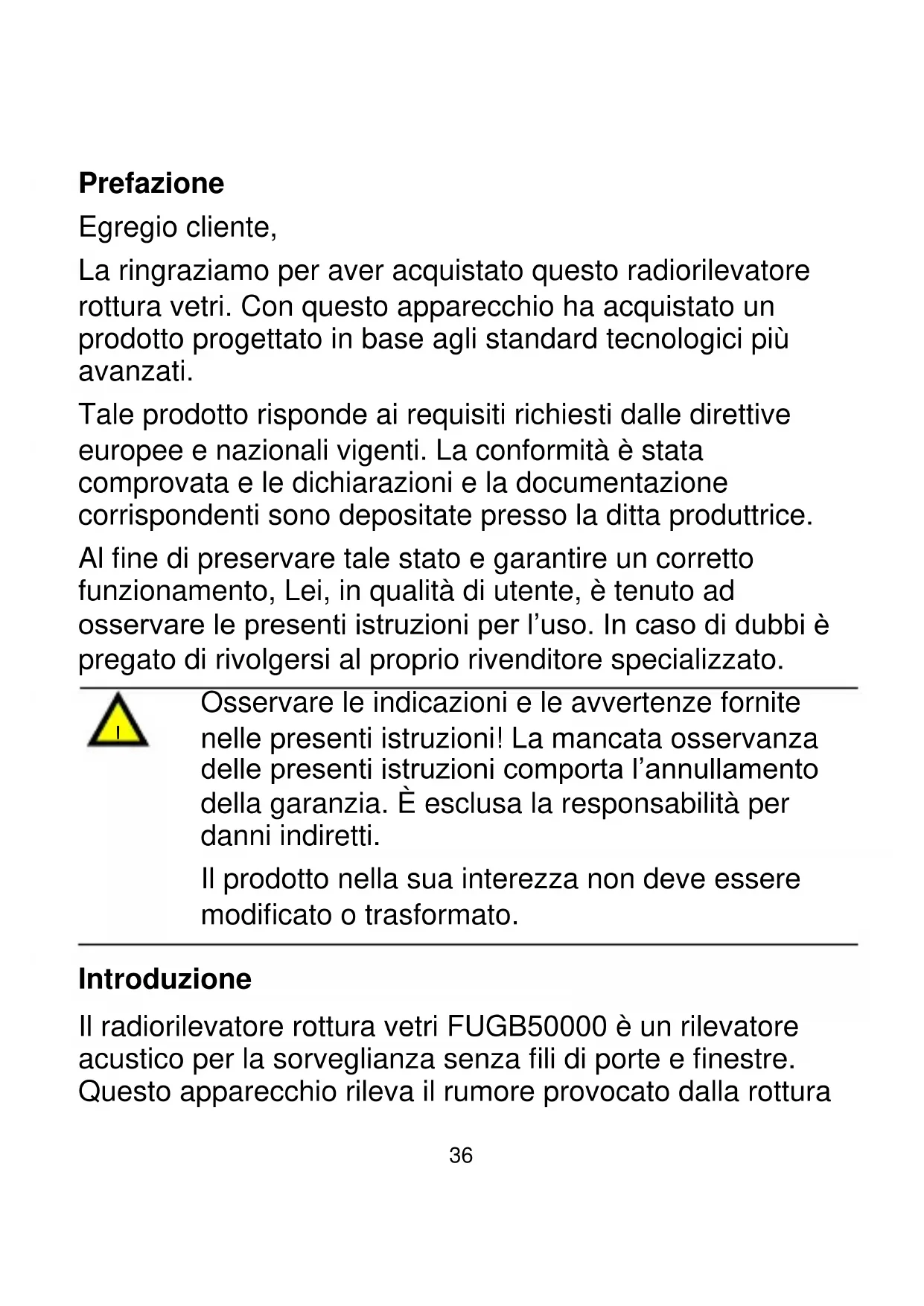 La ringraziamo per aver acquistato questo radiorilevatore rottura vetri. Con questo apparecchio ha acquistato un prodotto progettato in base agli standard tecnologici più avanzati.
