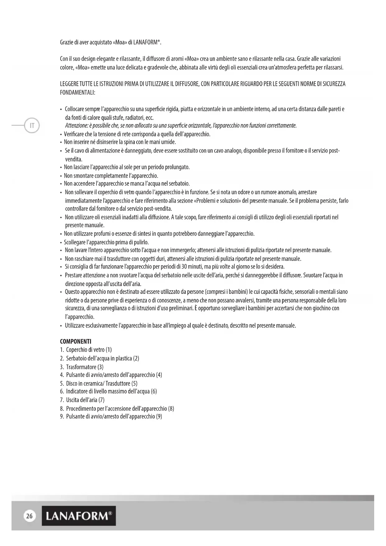 - Se desiderate gettare via l’apparecchio, smaltitelo in maniera rispettosa dell’ambiente e secondo le direttive di legge. GARANZIA LIMITATA LANAFORM® garantisce che questo prodotto è esente da vizi materiali e di fabbricazione per un periodo di due anni a partire dalla data di acquisto, fatta eccezione per le seguenti condizioni speciche. La garanzia LANAFORM® non copre i danni causati da una normale usura di questo prodotto. Inoltre, la garanzia su questo prodotto LANAFORM® non copre danni causati in seguito ad utilizzo improprio o abusivo o di qualsiasi uso errato, incidenti dovuti al collegamento di accessori non autorizzati, modiche apportate al prodotto o di qualsiasi altra condizione di qualsiasi natura, che sfugga al controllo di LANAFORM®. LANAFORM® non è responsabile per qualsiasi danno accessorio, consecutivo o speciale. Qualsiasi garanzia implicita o esplicita di conformità del prodotto è limitata ad un periodo di due anni a partire dalla data di acquisto iniziale e laddove sia disponibile una copia della prova di acquisto. Una volta ricevuto l’apparecchio, LANAFORM® si riserva di ripararlo o sostituirlo a seconda da del caso e di rispedirlo al cliente. La garanzia vale solo per interventi tramite il Centro Assistenza LANAFORM®. Qualsiasi intervento di manutenzione del prodotto adate a persone esterne al Centro assistenza LANAFORM® invalidano la presente garanzia. IT30 Благодарим вас за покупку устройства Moa компании LANAFORМ®. Благодаря своему изящному и расслабляющему дизайну ароматический диффузор Moa создает атмосферу здоровья и спокойствия в вашем доме. Moa служит источником приглушенного приятного света изменяющихся оттенков, который в сочетании с благотворным воздействием эфирных масел создает прекрасную расслабляющую атмосферу. ПОЛНОСТЬЮ ПРОЧТИТЕ ИНСТРУКЦИЮ ПЕРЕД НАЧАЛОМ ИСПОЛЬЗОВАНИЯ ДИФФУЗОРА, УДЕЛИВ ОСОБОЕ ВНИМАНИЕ ОСНОВНЫМ ПРАВИЛАМ ТЕХНИКИ БЕЗОПАСНОСТИ:
