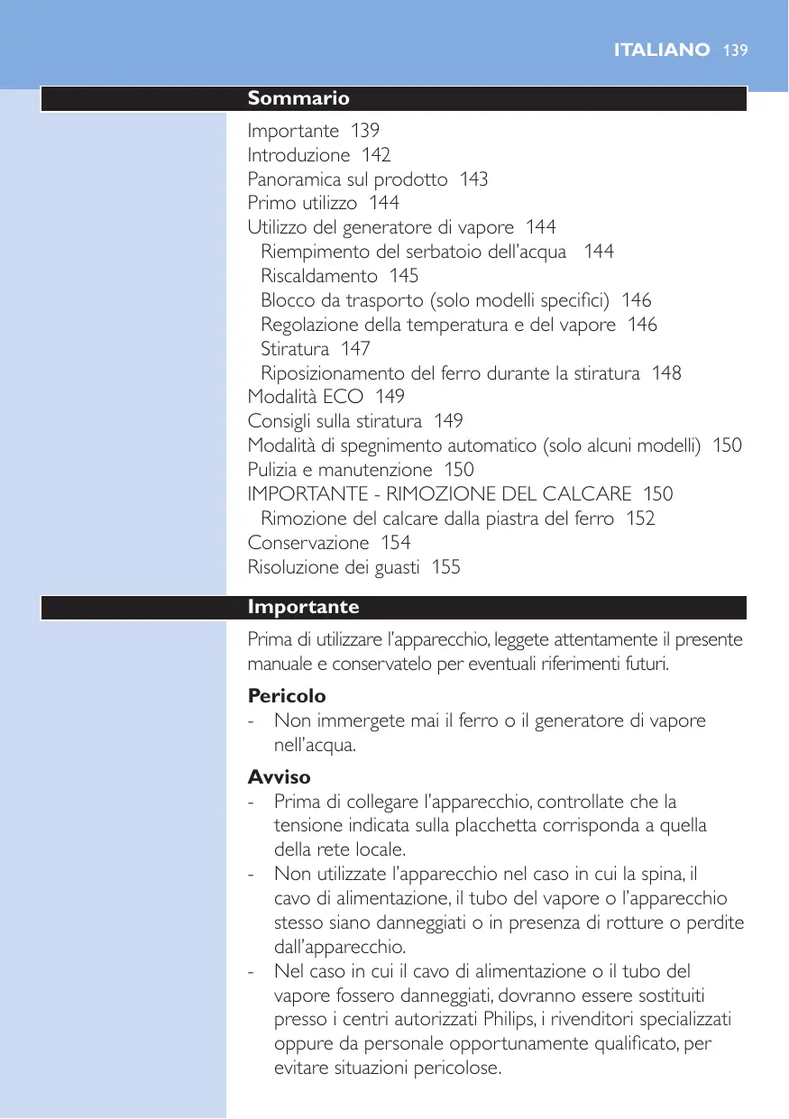 Temps de chauffe 126 Verrouillage du fer (certains modèles uniquement) 127 Température et réglage de la vapeur 128 Repassage 128 Mettre le fer sur son talon pendant le repassage 129 Mode ECO 130 Conseils pour le repassage 130 Mode Arrêt automatique (certains modèles uniquement) 131 Nettoyage et entretien 131 IMPORTANT - DÉTARTRAGE 131 Détartrer la semelle du fer 133 Rangement 135 Dépannage 136 -- N’utilisez pas l’appareil si la fiche, le cordon d’alimentation, le cordon d’arrivée de la vapeur ou l’appareil lui-même est endommagé, s’il est tombé ou s’il fuit. -- Si le cordon d’alimentation ou le cordon d’arrivée de la vapeur est endommagé, il doit être remplacé par Philips, par un Centre Service Agréé Philips ou par une personne qualifiée afin d’éviter tout accident. -- Ne laissez jamais l’appareil sans surveillance pendant qu’il est branché.
