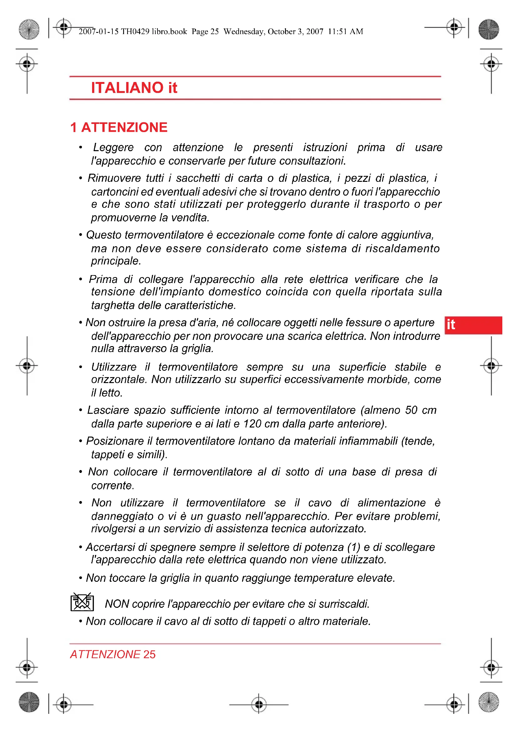 - Posizione are il termoventilatore lontano da materiali inflammabili (tende, tappeti e simili).