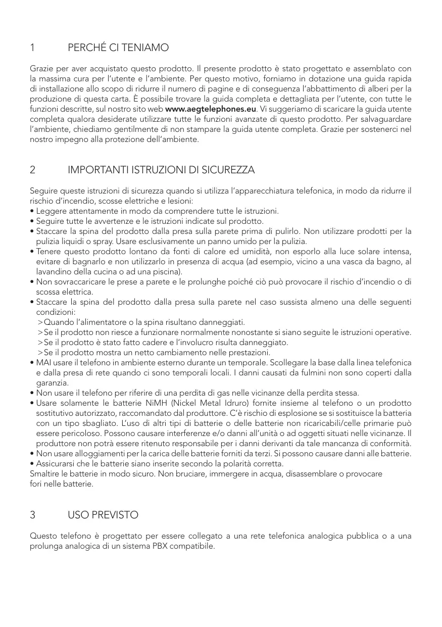 Grazie per aver acquistato questo prodotto. Il presente prodotto è stato progettato e assemblato con la massima cura per l‘utente e l‘ambiente. Per questo motivo, forniamo in dotazione una guida rapida di installazione allo scopo di ridurre il numero di pagine e di conseguenza l‘abbattimento di alberi per la produzione di questa carta. È possibile trovare la guida completa e dettagliata per l’utente, con tutte le funzioni descritte, sul nostro sito web www.aegtelephones.eu. Vi suggeriamo di scaricare la guida utente completa qualora desiderate utilizzare tutte le funzioni avanzate di questo prodotto. Per salvaguardare l’ambiente, chiediamo gentilmente di non stampare la guida utente completa. Grazie per sostenerci nel nostro impegno alla protezione dell‘ambiente.