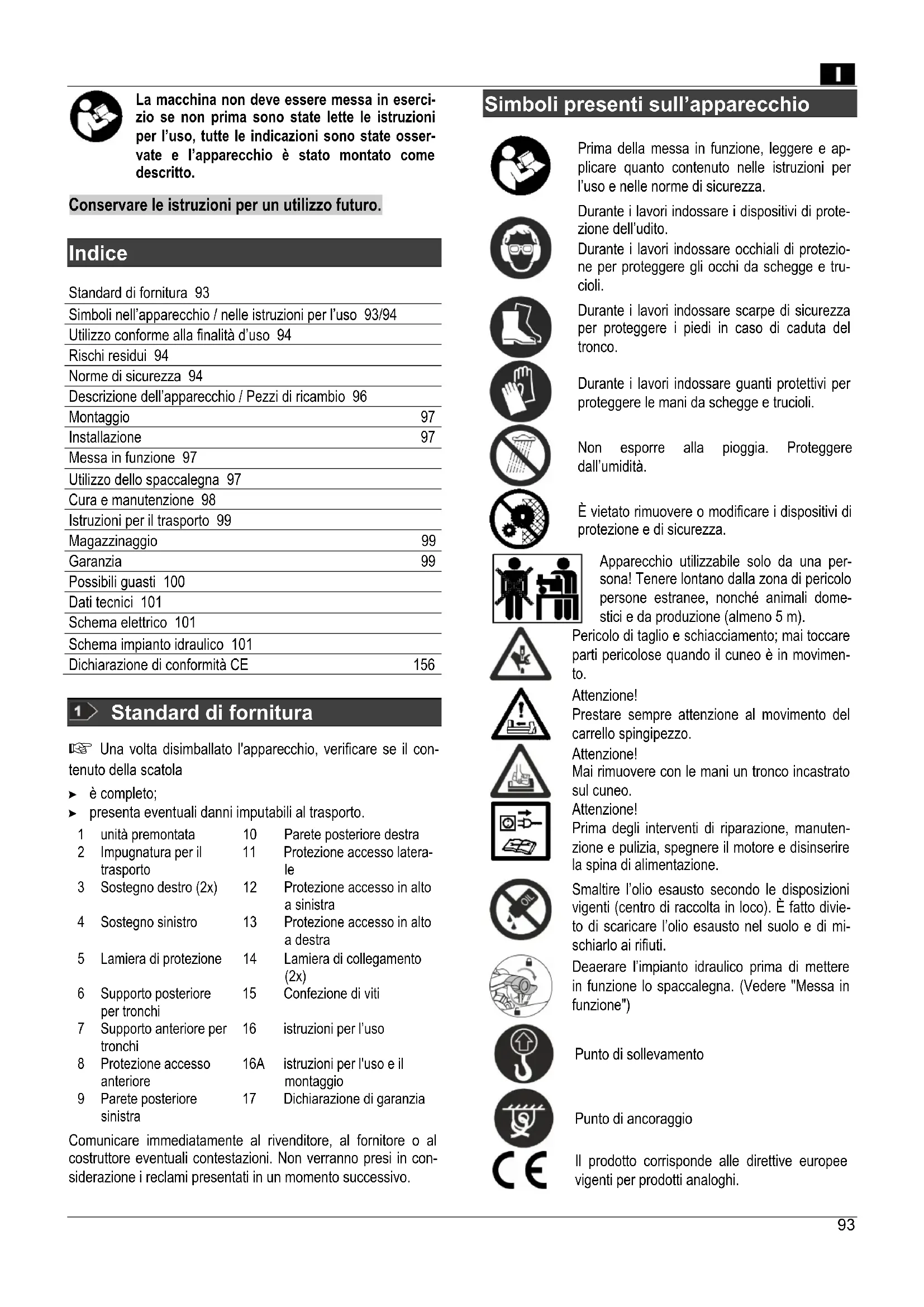 Indice Standard di fornitura 93 Simboli nell’apparecchio / nelle istruzioni per l’uso 93/94 Utilizzo conforme alla finalità d’uso 94 Rischi residui 94 Norme di sicurezza 94 Descrizione dell’apparecchio / Pezzi di ricambio 96 Montaggio 97 Installazione 97 Messa in funzione 97 Utilizzo dello spaccalegna 97 Cura e manutenzione 98 Istruzioni per il trasporto 99 Magazzinaggio 99 Garanzia 99 Possibili guasti 100 Dati tecnici 101 Schema elettrico 101 Schema impianto idraulico 101 Dichiarazione di conformità CE 156