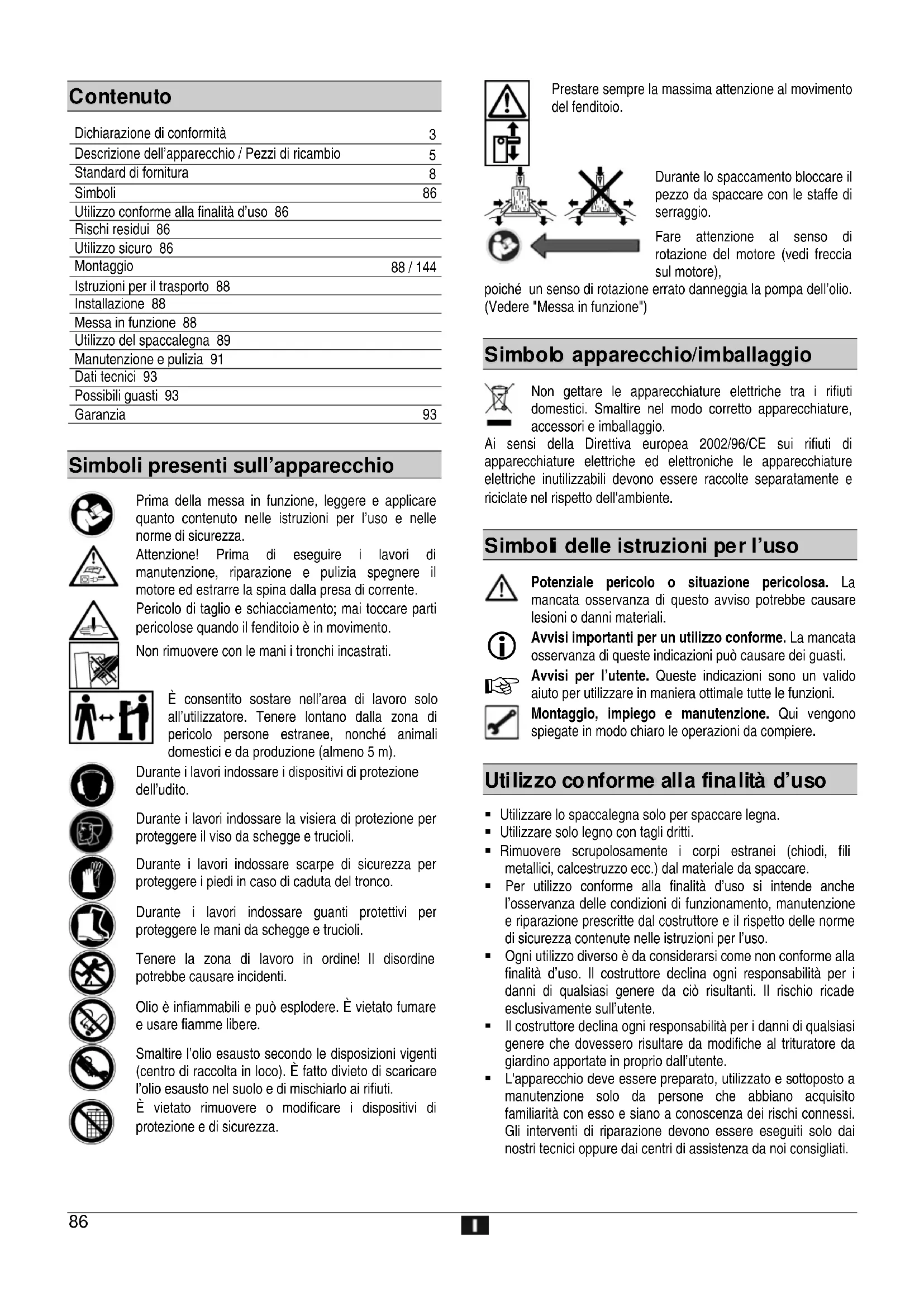 Simboli 86 Utilizzo conforme alla finalità d’uso 86 Rischi residui 86 Utilizzo sicuro 86 Montaggio 88 / 144 Istruzioni per il trasporto 88 Installazione 88 Messa in funzione 88 Utilizzo del spaccalegna 89 Manutenzione e pulizia 91 Dati tecnici 93 Possibili guasti 93 Garanzia 93
