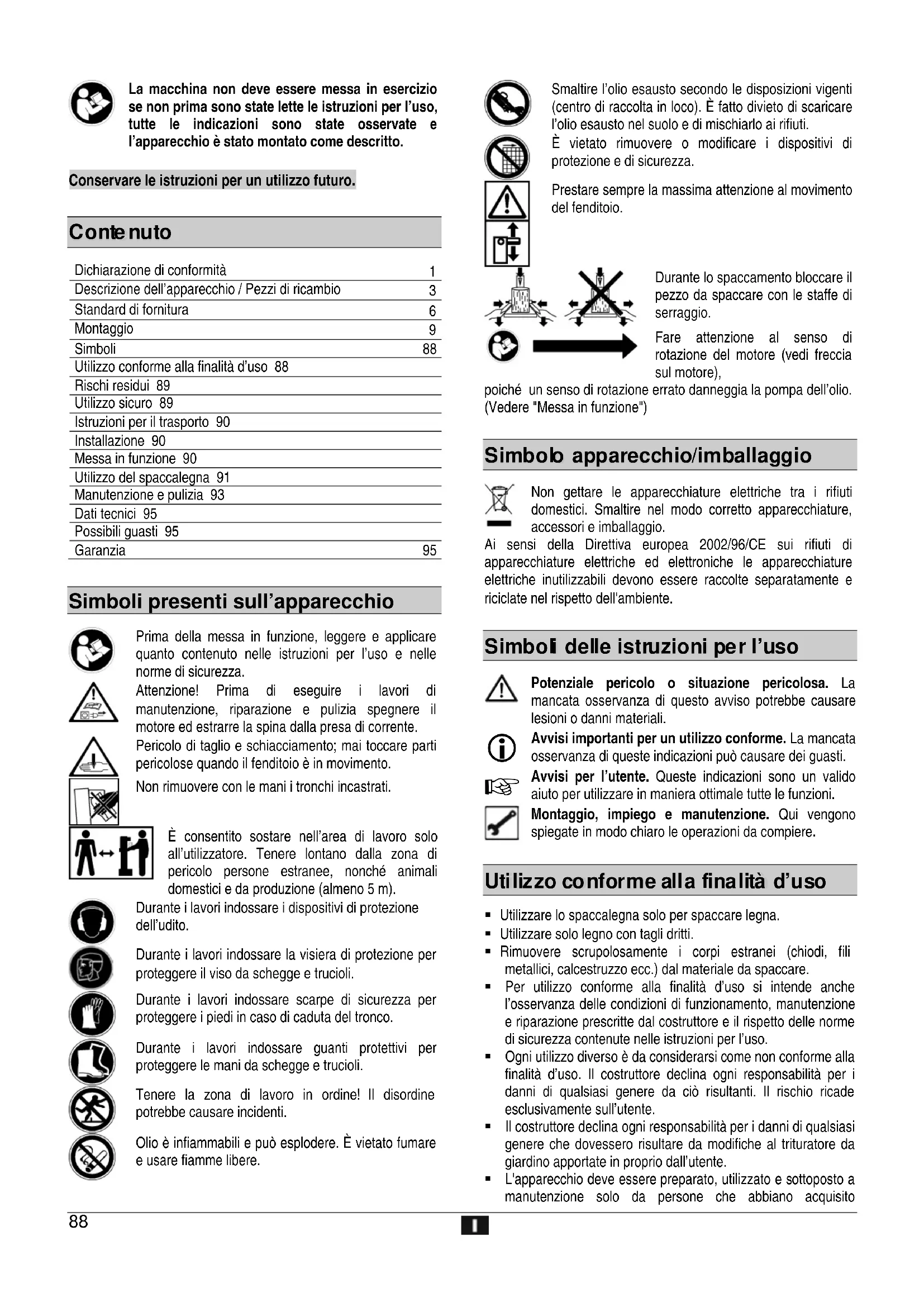 Simboli 88 Utilizzo conforme alla finalità d’uso 88 Rischi residui 89 Utilizzo sicuro 89 Istruzioni per il trasporto 90 Installazione 90 Messa in funzione 90 Utilizzo del spaccalegna 91 Manutenzione e pulizia 93 Dati tecnici 95 Possibili guasti 95 Garanzia 95