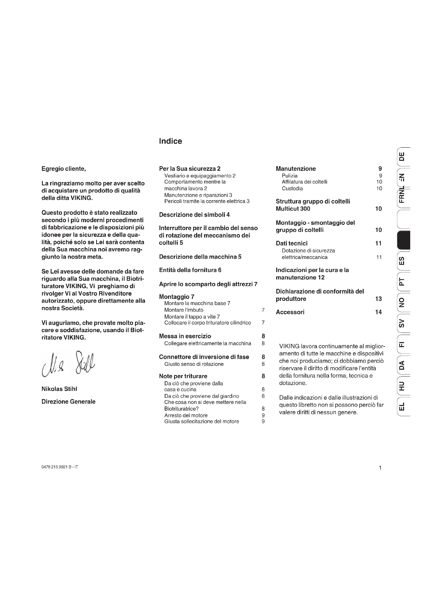 Egregio cliente, La ringraziamo molto per aver scelto di acquistare un prodotto di qualità della ditta VIKING. Questo prodotto è stato realizzato secondo i più moderni procedimenti di fabbricazione e le disposizioni più idonee per la sicurezza e della qua- lità, poiché solo se Lei sarà contenta della Sua macchina noi avremo rag- giunto la nostra meta. Se Lei avesse delle domande da fare riguardo alla Sua macchina, il Biotri- turatore VIKING, Vi preghiamo di rivolger Vi al Vostro Rivenditore autorizzato, oppure direttamente alla nostra Società. Vi auguriamo, che provate molto pia- cere e soddisfazione, usando il Biot- ritatore VIKING. Nikolas Stihl Direzione Generale Indice VIKING lavora continuamente al miglior- amento di tutte le macchine e dispositivi che noi produciamo; ci dobbiamo perciò riservare il diritto di modificare l'entità della fornitura nella forma, tecnica e dotazione. Dalle indicazioni e dalle illustrazioni di questo libretto non si possono perciò far valere diritti di nessun genere. Per la Sua sicurezza 2 Vestiario e equipaggiamento 2 Comportamento mentre la macchina lavora 2 Manutenzione e riparazioni 3 Pericoli tramite la corrente elettrica 3 Descrizione dei simboli 4 Interruttore per il cambio del senso di rotazione del meccanismo dei coltelli 5 Descrizione della macchina 5 Entità della fornitura 6 Aprire lo scomparto degli attrezzi 7 Montaggio 7 Montare la macchina base 7 Montare l'imbuto 7 Montare il tappo a vite 7 Collocare il corpo trituratore cilindrico 7 Messa in esercizio 8 Collegare elettricamente la macchina 8 Connettore di inversione di fase 8 Giusto senso di rotazione 8 Note per triturare 8 Da ciò che proviene dalla casa e cucina 8 Da ciò che proviene dal giardino 8 Che cosa non si deve mettere nella Biotrituratrice? 8 Arresto del motore 9 Giusta sollecitazione del motore 9 Manutenzione 9 Pulizia 9 Affilatura dei coltelli 10 Custodia 10 Struttura gruppo di coltelli Multicut 300 10 Montaggio - smontaggio del gruppo di coltelli 10 Dati tecnici 11 Dotazione di sicurezza elettrica/meccanica 11 Indicazioni per la cura e la manutenzione 12 Dichiarazione di conformità del produttore 13 Accessori 140478 215 9921 B - IT