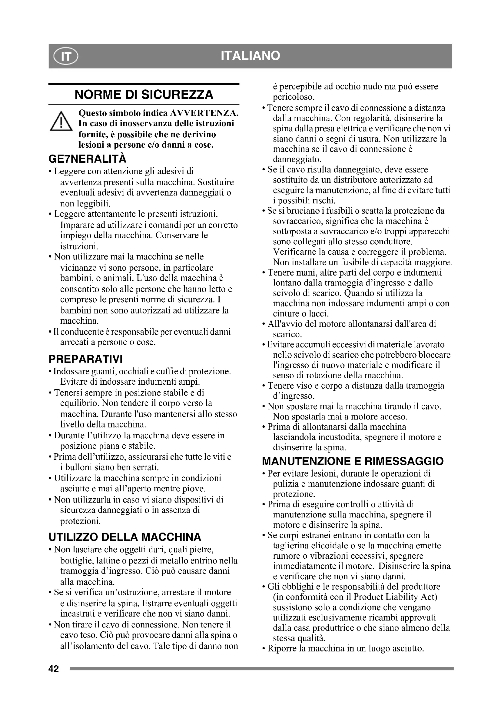 - Tenere mani, altre parti del corpo e indumenti lontano dalla tramoggia d’ingresso e dallo scivolo di scarico. Quando si utilizza la macchina non indossare indumenti ampi o con cinture o lacci.
