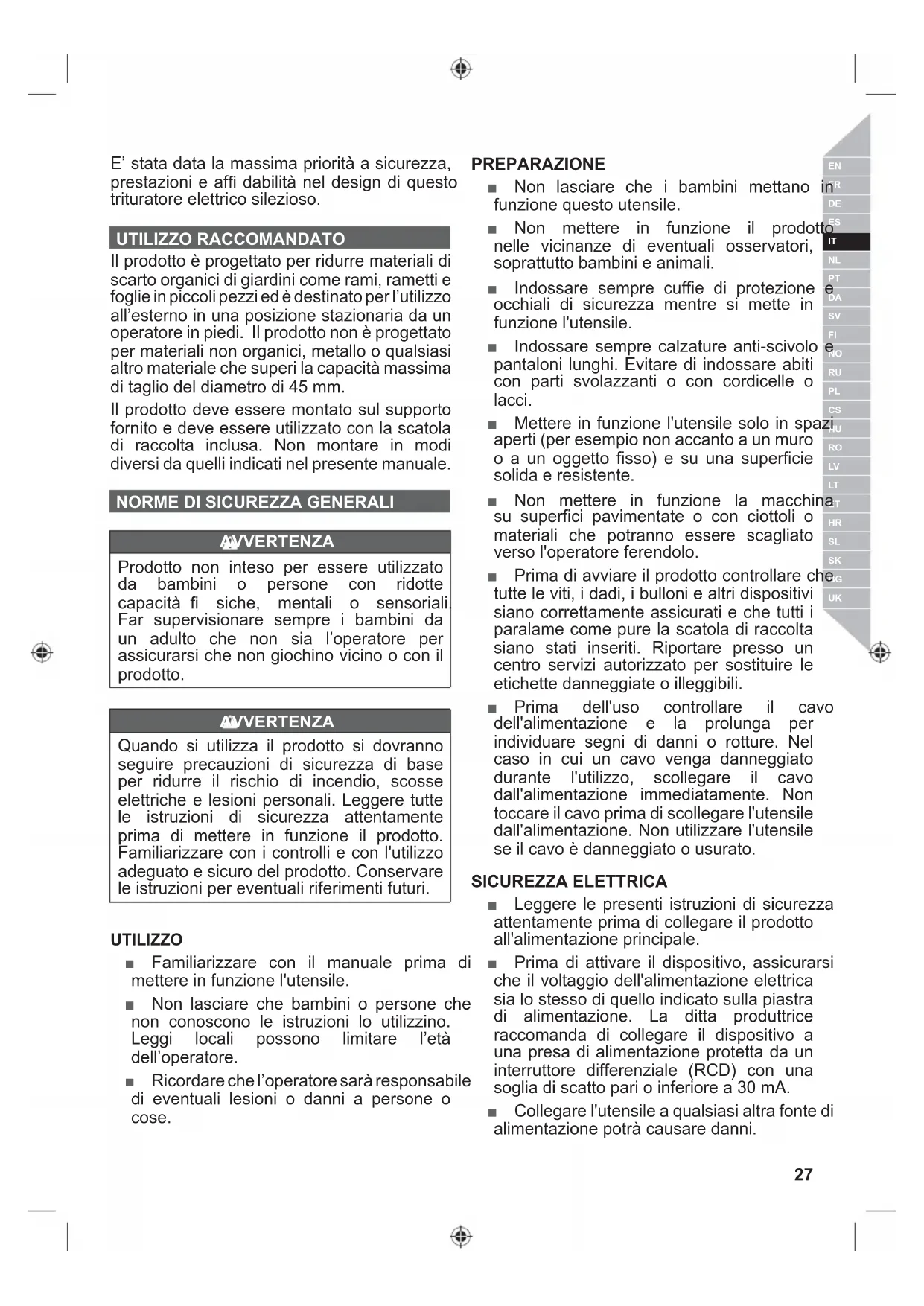 Il prodotto è progettato per ridurre materiali di scarto organici di giardini come rami, rametti e foglie in piccoli peszzi ed è destinato per l'utilizzo all'esterno in una posizione stazionaria da un operatore in piedi. Il prodotto non è progettato per materiali non organici, metallo o qualsiasi altri materiale che superi la capacité massima di taglio del diametro di 45 mm.