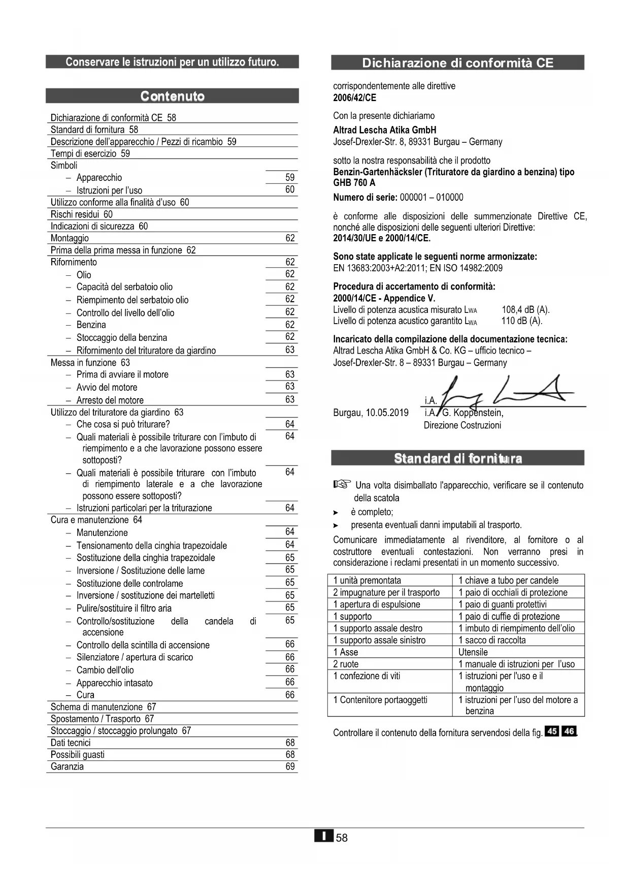 corrispondentemente alle direttive 2006/42/CE Con la presente dichiariamo Altrad Lescha Atika GmbH Josef-Drexler-Str. 8, 89331 Burgau – Germany sotto la nostra responsabilità che il prodotto Benzin-Gartenhäcksler (Trituratore da giardino a benzina) tipo GHB 760 A Numero di serie: 000001 – 010000 è conforme alle disposizioni delle summenzionate Direttive CE, nonché alle disposizioni delle seguenti ulteriori Direttive: 2014/30/UE e 2000/14/CE. Sono state applicate le seguenti norme armonizzate: